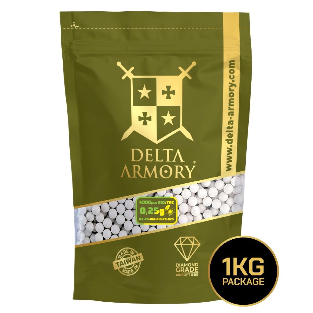 - Biologicky odbouratelné tracer kuličky Delta Armory DIAMOND 0,25 g pro airsoftové zbraně.