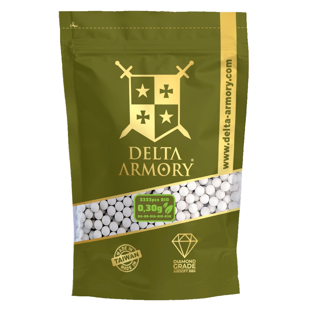 - Vysoce kvalitní airsoftové kuličky BIO BB Delta Armory Diamond 0.30g/3330 s biologicky odbouratelným složením.