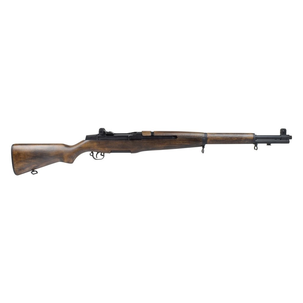 - Realistická replika poloautomatické pušky M1 Garand s elektrickým pohonem (AEG), vybavená dřevěnou pažbou a kovovými díly.