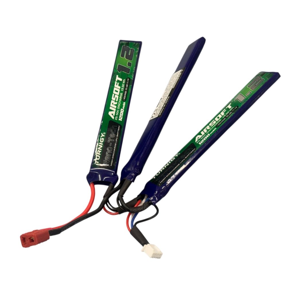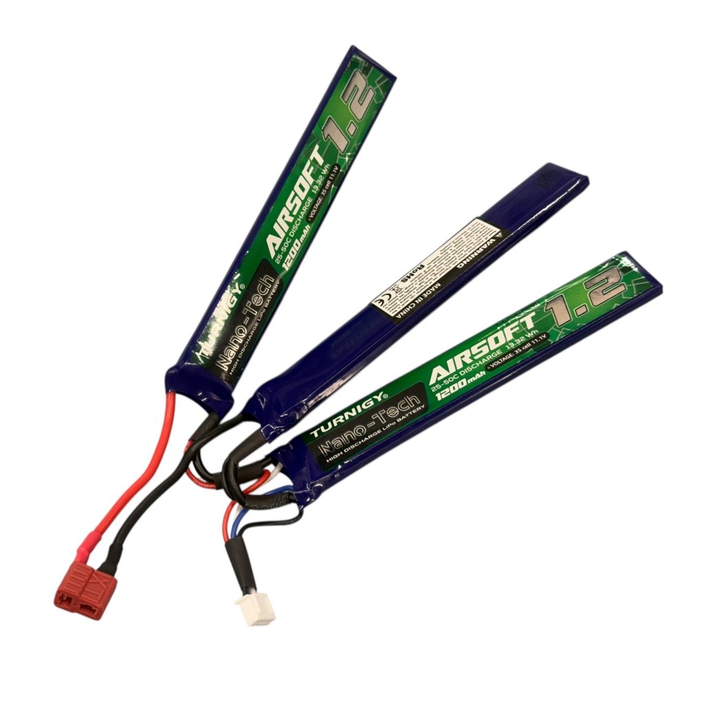 Lithium-polymerový akumulátor TURNIGY Nano-Tech s napětím 11,1 V a kapacitou 1200 mAh je určen pro aplikace vyžadující vysoký výkon a spolehlivost. Maximální vybíjecí proud činí 25–50C, což zajišťuje stabilní dodávku energie i při náročném provozu. Akumulátor je proveden ve V-Typ konstrukci s konektorem T-Dean, což umožňuje snadnou instalaci do RIS předpažbí nebo Crane pažeb airsoftových replik. Každý článek má rozměry 116 × 16 × 6 mm, celková hmotnost baterie je 143 g. Díky kompaktním rozměrům je vhodný pro použití v omezených prostorách zbraní s požadavkem na vysokou proudovou zatížitelnost.