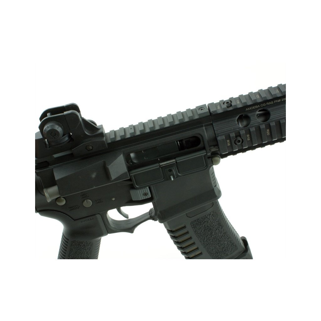 ARES Amoeba AM-008 Combat Gear Series (černá) vychází z osvědčené platformy M4 RIS a kombinuje realistický vzhled s moderními technologiemi. Tělo, pažba, pažbička a předpažbí jsou vyrobeny z polymeru vyztuženého nylonovými vlákny, který nabízí nízkou hmotnost a vysokou odolnost. Kovové části zahrnují hlaveň a vybrané konstrukční prvky. Zbraň je vybavena horní RIS lištou pro montáž optiky, 14mm pravotočivým závitem pro tlumič a nastavitelnou pažbou typu Crane se šesti polohami.