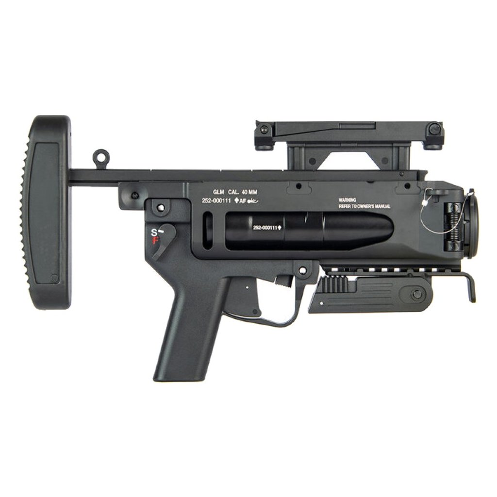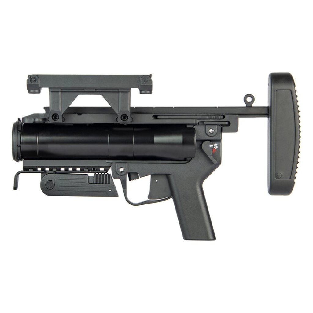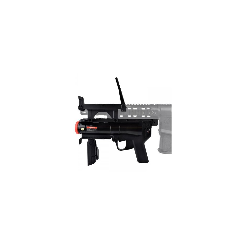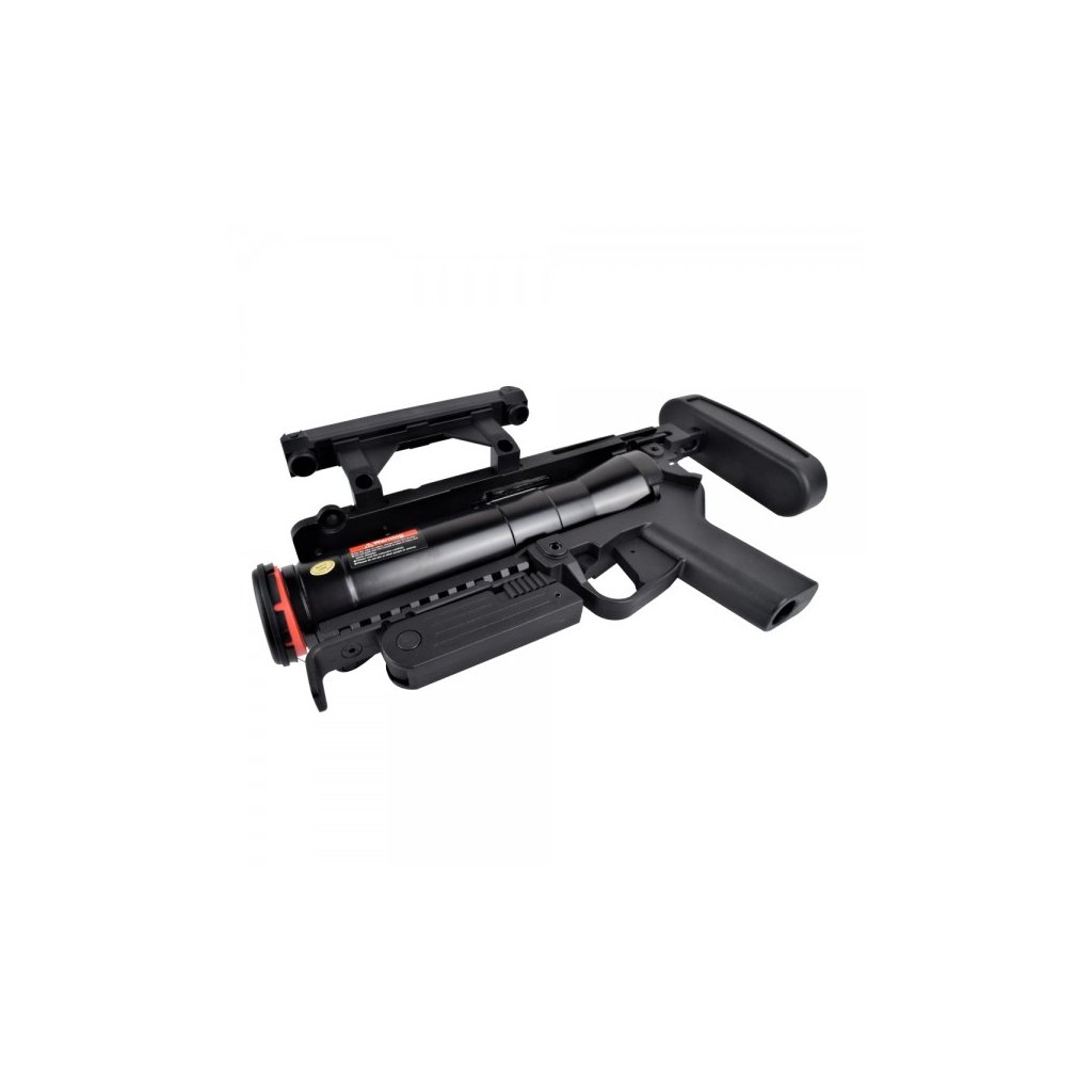 Granátomet je vybaven pogumovanou ramenní opěrkou pro zvýšený komfort při střelbě, sklopnou přední vertikální rukojetí a bezpečnostními výklopnými mířidly, která lze instalovat na levou nebo pravou stranu podle preferencí uživatele. Díky pevné konstrukci a promyšlenému designu je vhodný pro náročné hráče, kteří požadují realistickou, funkční a odolnou výbavu.
