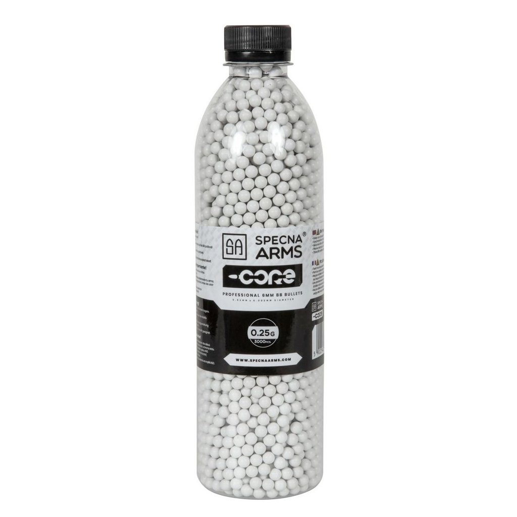 Průměr kuliček je 5,95 mm (+/- 0,005 mm) a rozdíly v hmotnosti jednotlivých kuliček nepřesahují 0,01 g. Výsledkem je, že kuličky Specna Arms budou perfektně fungovat jak ve standardních vnitřních hlavních, tak v upravených replikách vybavených přesnými hlavněmi.