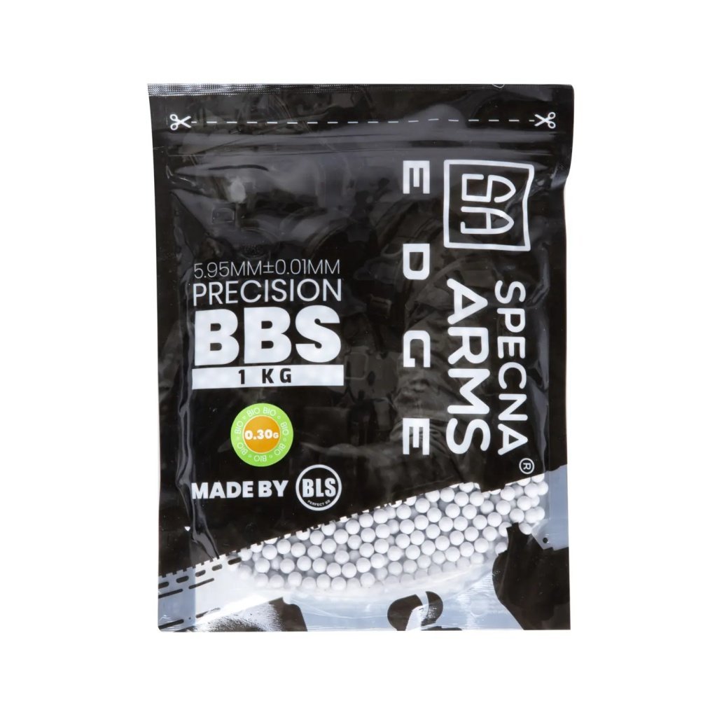 BB Specna Arms EDGE BIO 0.30/3300 (bílé) Biodegradabilní BB kuličky Specna Arms EDGE o hmotnosti 0,30 g poskytují konzistentní balistiku, rovnoměrnou hmotnost a hladký povrch pro spolehlivé podávání a snížený rozptyl; balení 3300 kusů je vhodné pro náročné tréninky i soutěžní použití a použitý biologicky rozložitelný materiál snižuje ekologický dopad při venkovním použití.