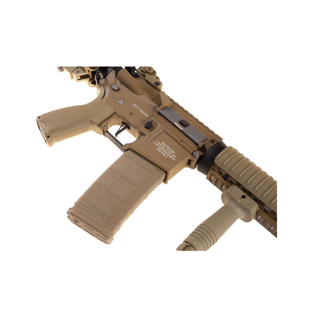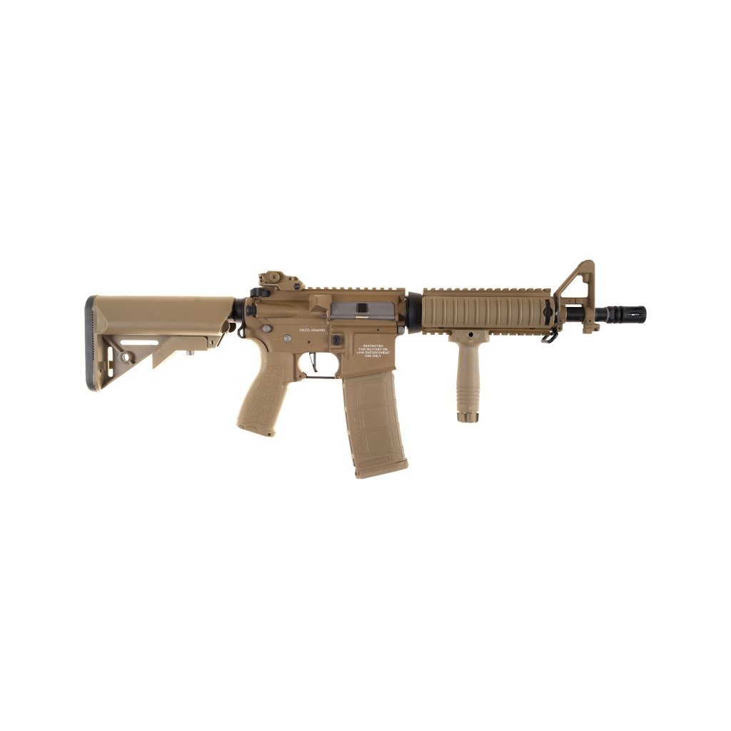 Delta Armory AR15 CQB‑R ALPHA Full Metal Full‑Tan patří do nejnovější Alpha série výrobce Delta Armory a představuje špičku ve své cenové kategorii. Replika je kompletně celokovová, s realistickým zpracováním, ražením „Delta Armory“ a unikátním sériovým číslem. Díky kompaktním rozměrům je ideální pro boj v uzavřených prostorech, ale díky výkonu a přesné hlavni se neztratí ani na otevřených hřištích.