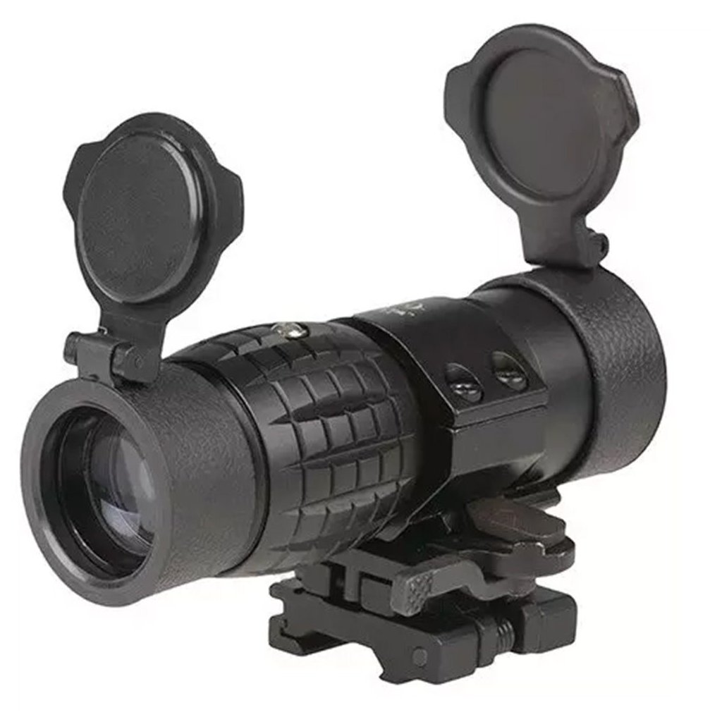 The optics have a mount with a hinge that allows it to be folded to the side when not in use. The same magnifier for mounting on a RIS rail is installed on a stable QD latch.