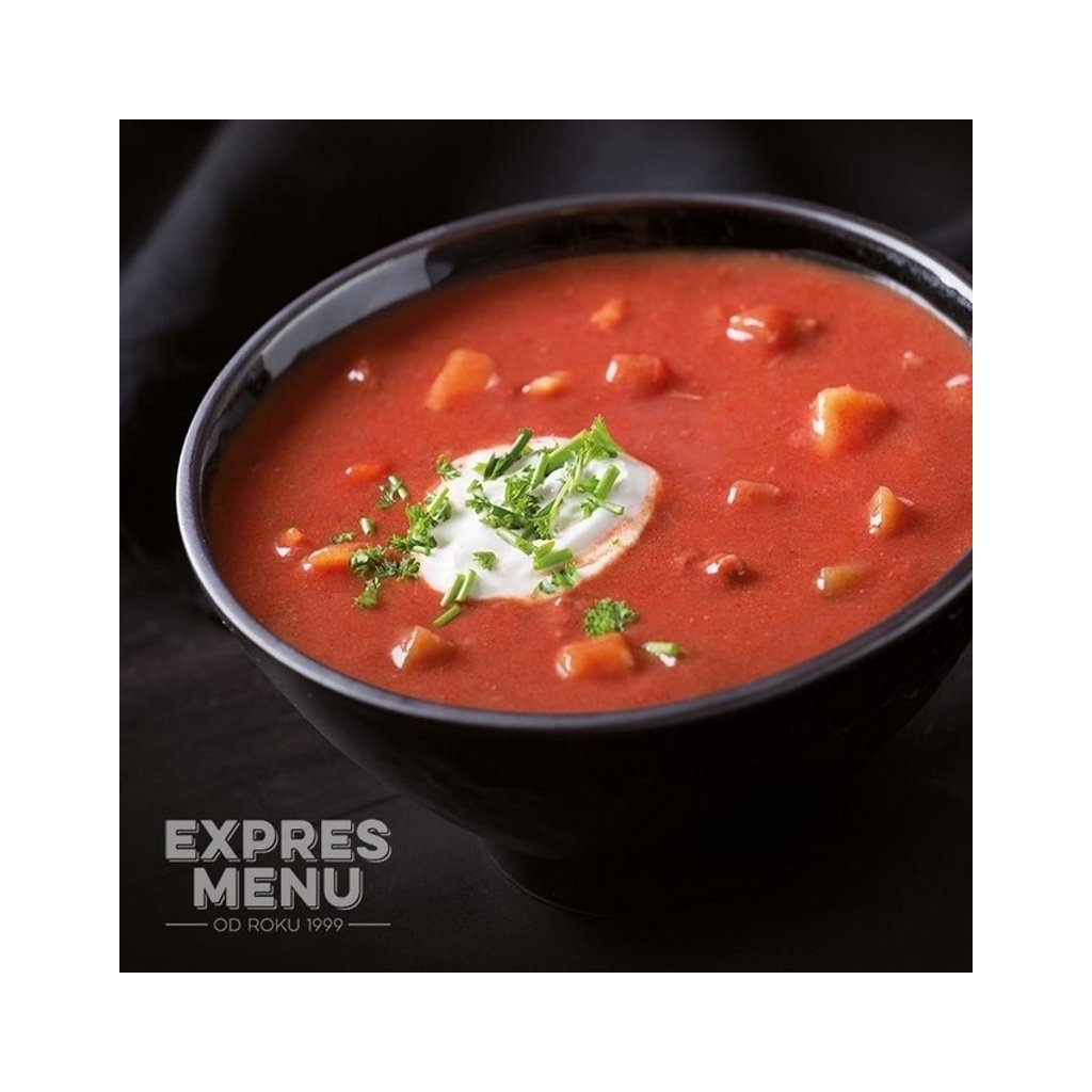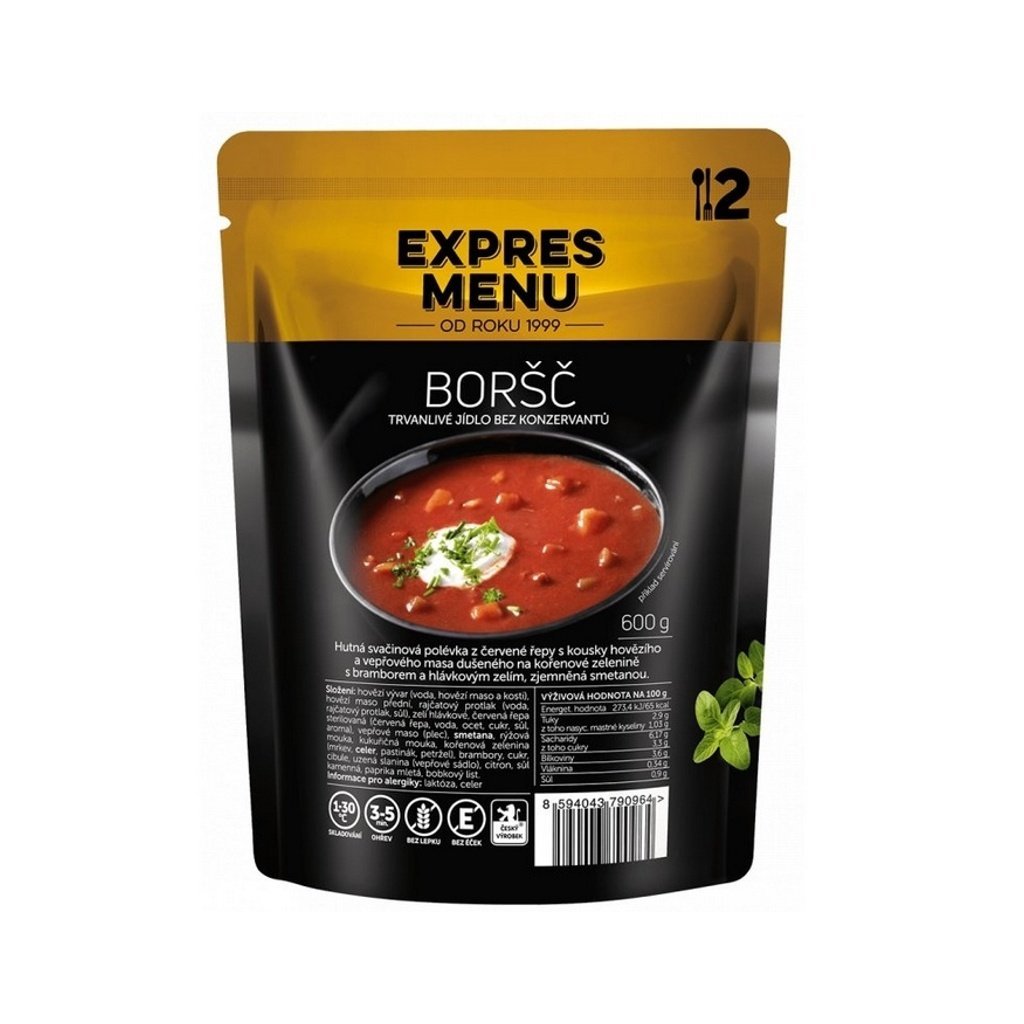 Borscht (2 Portions 600g) - Expres menu Ready-made Borscht Expres menu combines beetroot, other root and leafy vegetables, broth, and seasoned flavourings for a full and balanced taste typical of Eastern European soups; ideal as a main hot meal or soup for dinner, just heat and serve with a side dish to taste, practical 600g packaging is enough for approximately two portions and is suitable for home or quick use on the go.