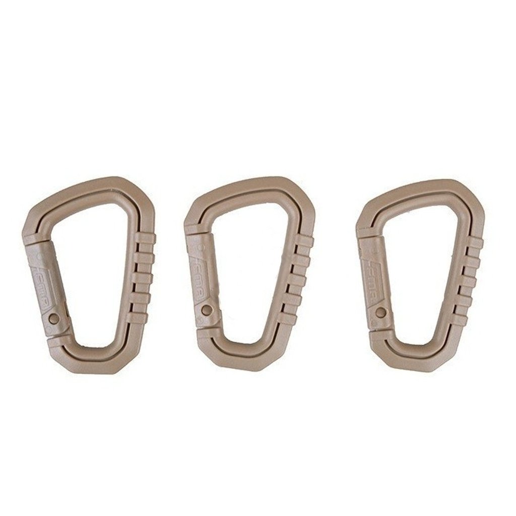 Set of three universal carabiners made of durable polymer. They are equipped with a simple snap closure. An ideal replacement for traditional metal carabiners and a great addition to a tactical vest, backpack, etc.