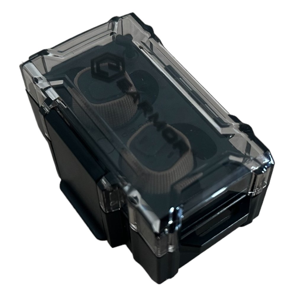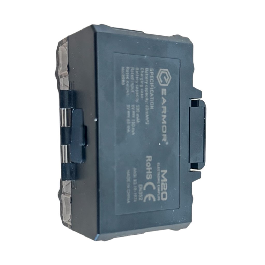 The M20 has a noise reduction (NRR) of 22 dB and a waterproof rating of IPX-4. Active guards hearing aids are equipped with a battery that allows the device to operate for up to 8 hours, and charging takes place in a portable charging container. The charging container has its own battery charged with the included USB-C cable.