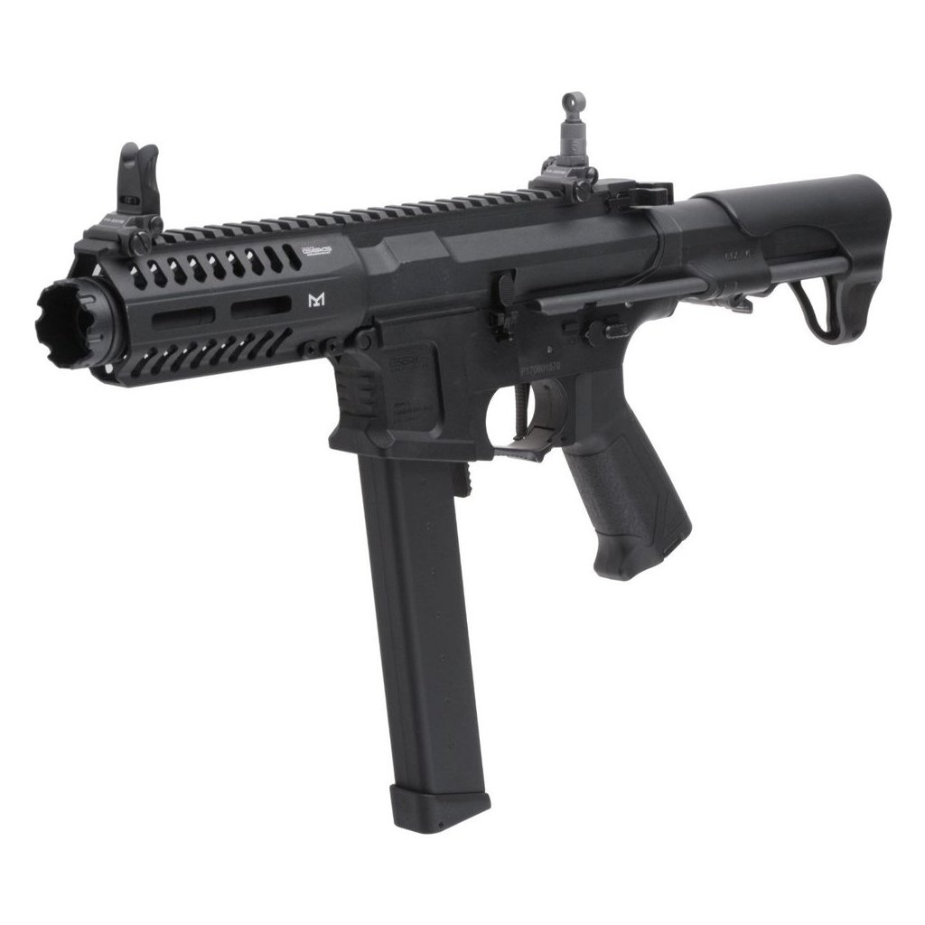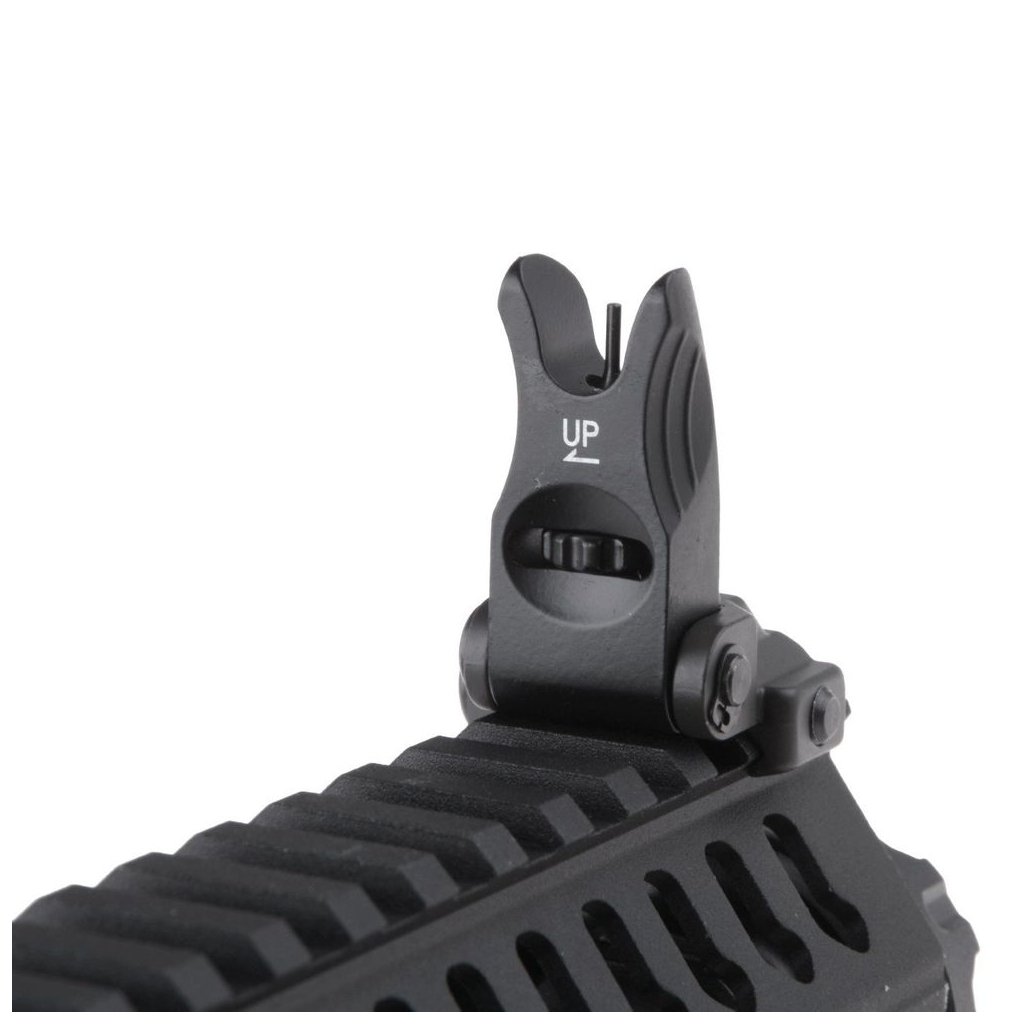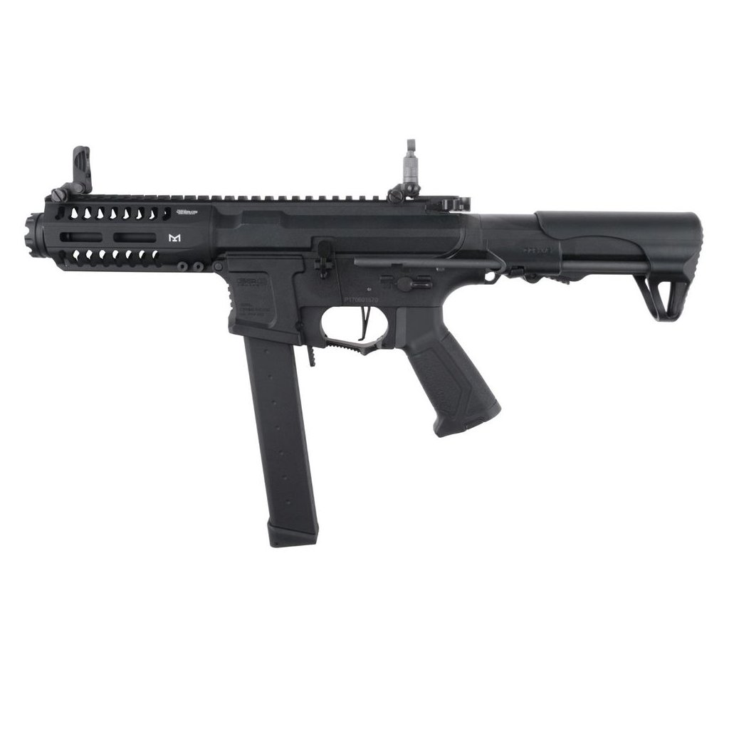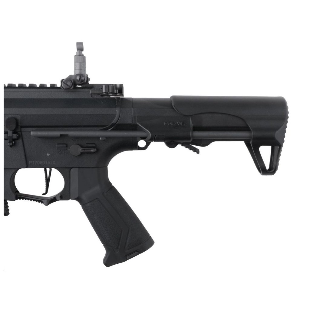 At first glance, the replica resembles another AR-15 replica, but apart from the implementation of the V2 gearbox or pistol grip, the similarities end there. We get a solid and compact PDW replica. The replica features a folding stock made of steel and polymer. The stock mount contains a battery connector (not included) and a MOSFETunit. The replica includes a custom pistol grip, trigger, and M-LOK® metal rail with license markings. There are flip-up sights at the top of the replica. In addition to the strong polymer , the replica also has steel elements, including the stock element, the shell ejection flap that opens with the charging handle, as well as screws and pins. Barrel replica has its own muzzle. The set includes a Hi-Cap magazine with a capacity of up to 300 BBs.