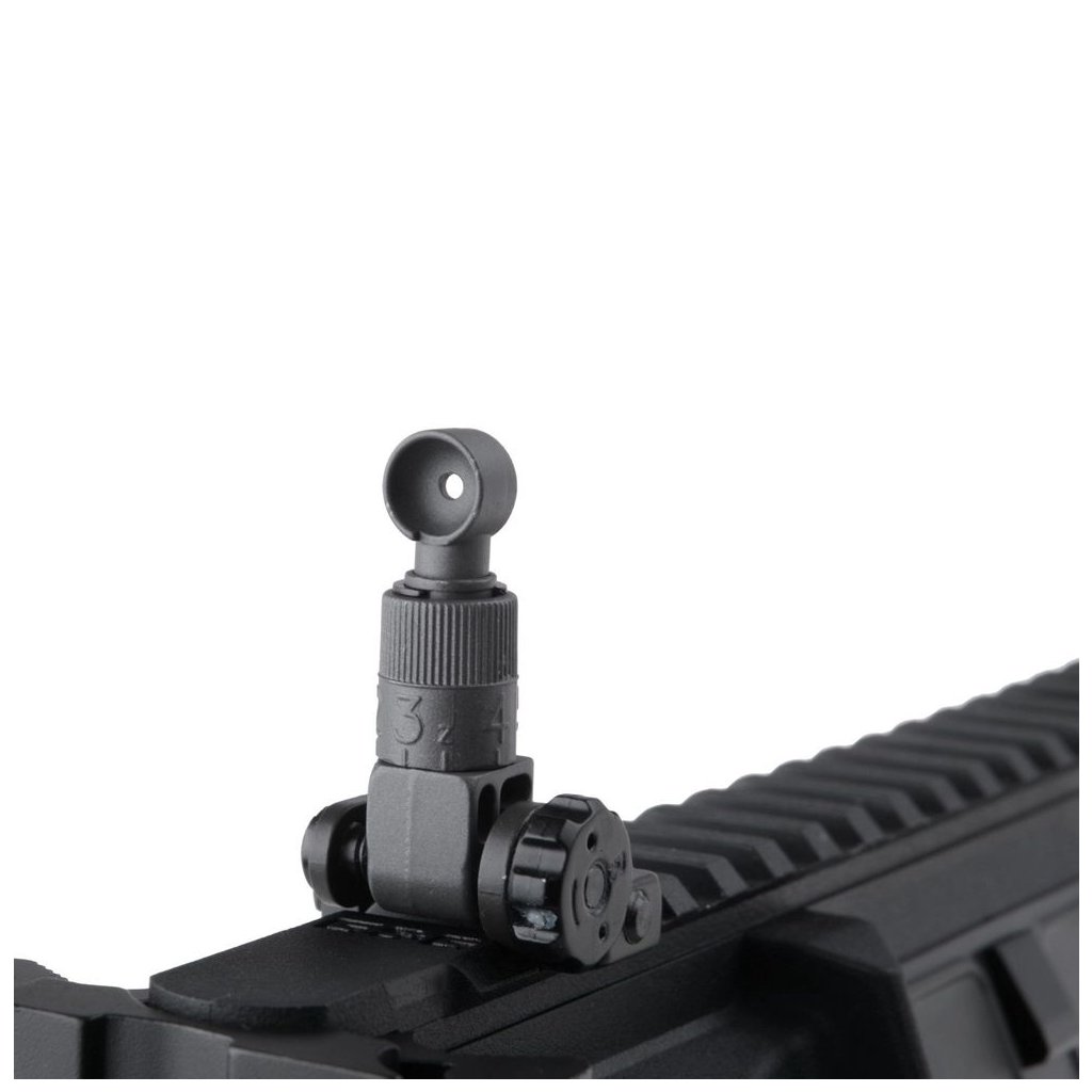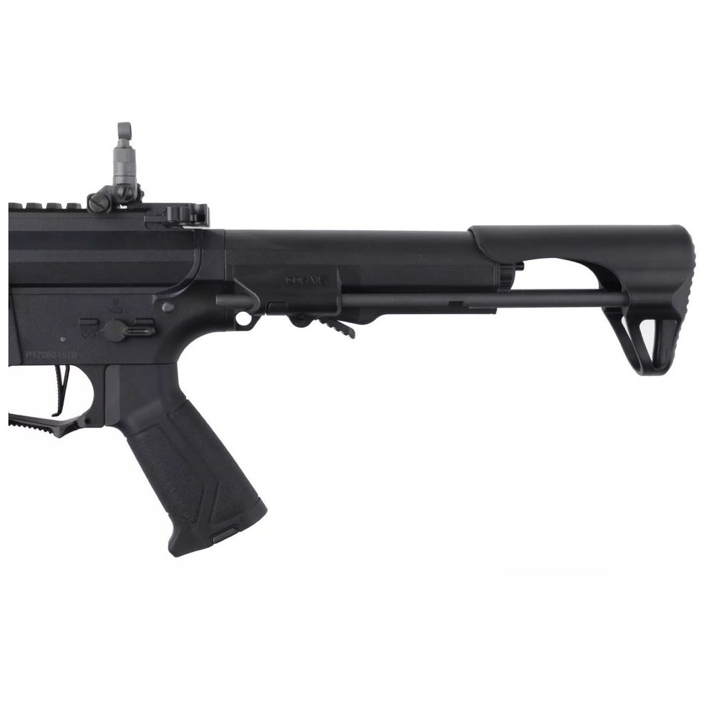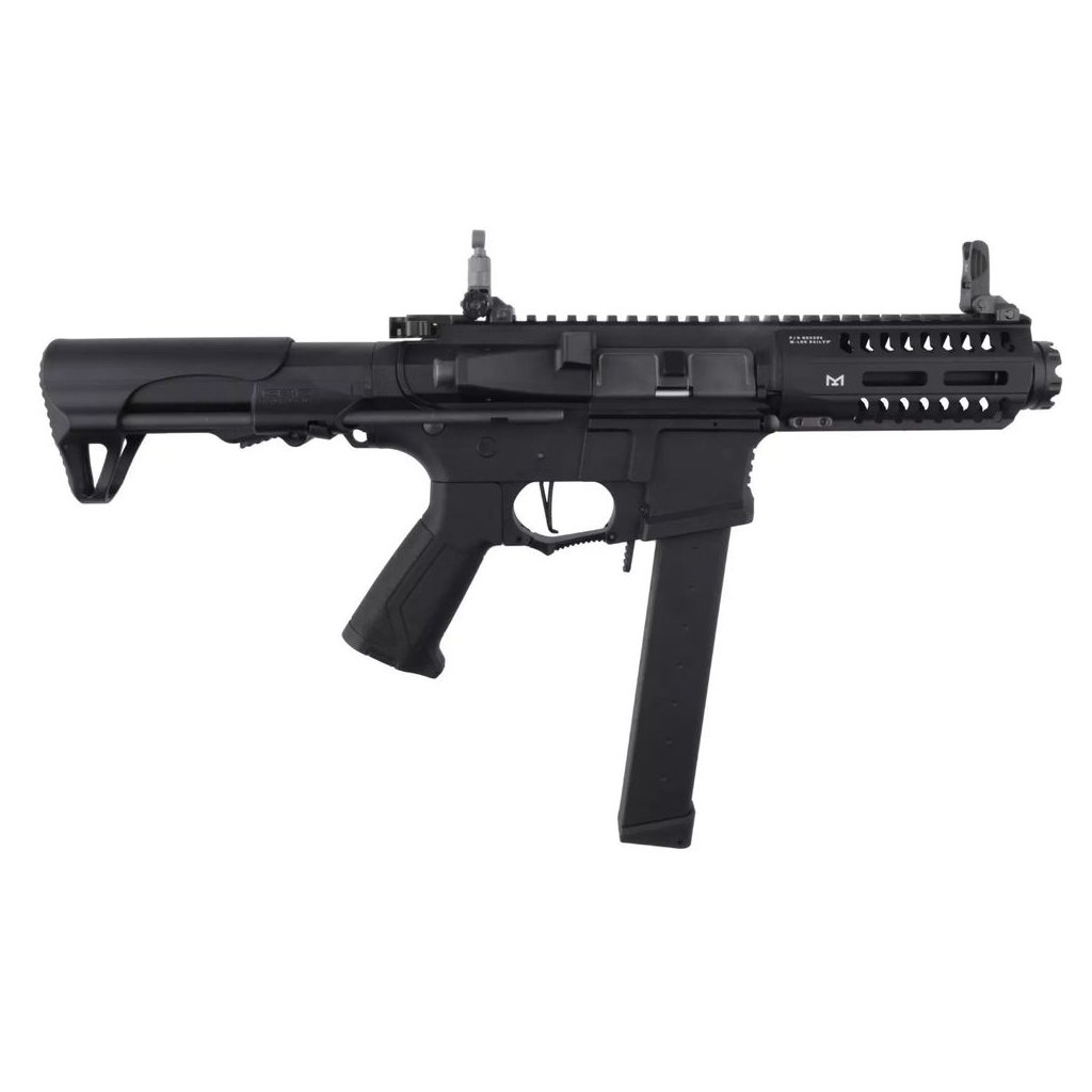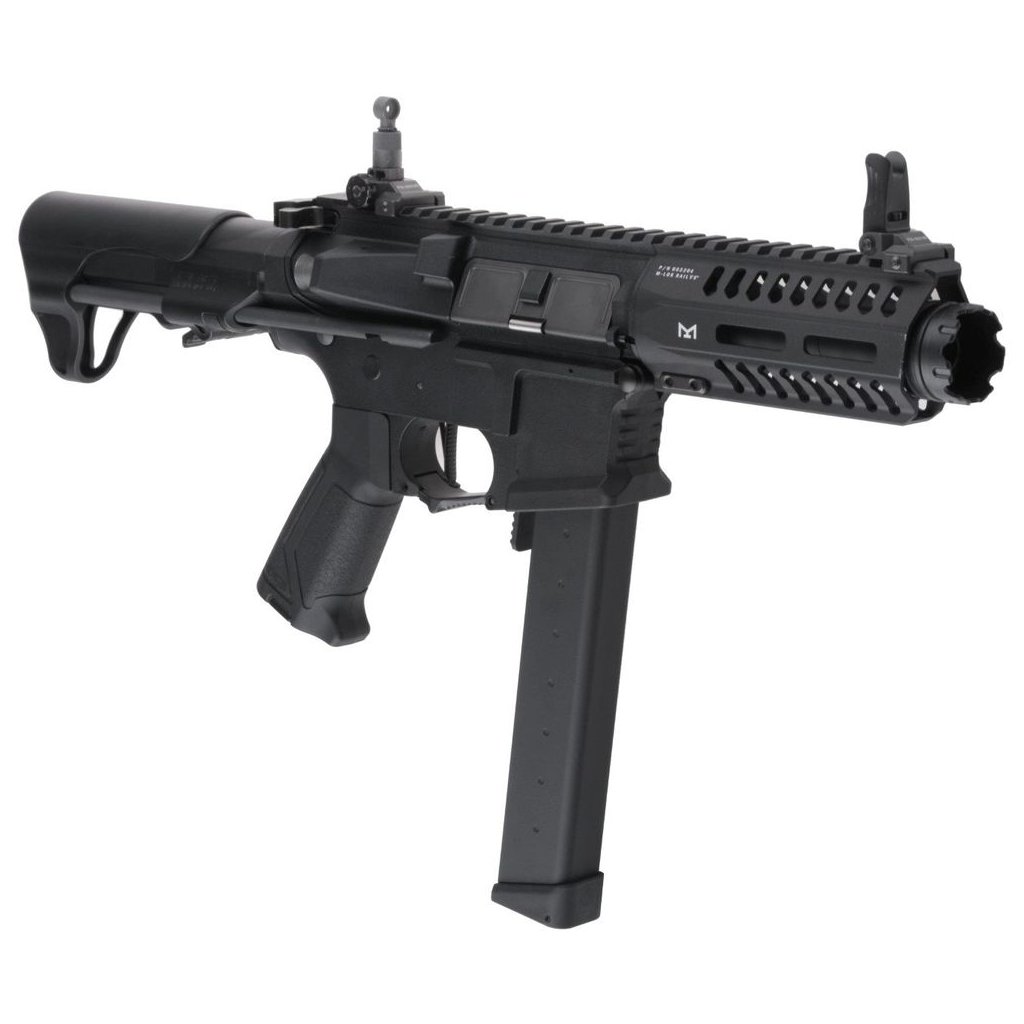 At first glance, the replica resembles another AR-15 replica, but apart from the implementation of the V2 gearbox or pistol grip, the similarities end there. We get a solid and compact PDW replica. The replica features a folding stock made of steel and polymer. The stock mount contains a battery connector (not included) and a MOSFETunit. The replica includes a custom pistol grip, trigger, and M-LOK® metal rail with license markings. There are flip-up sights at the top of the replica. In addition to the strong polymer , the replica also has steel elements, including the stock element, the shell ejection flap that opens with the charging handle, as well as screws and pins. Barrel replica has its own muzzle. The set includes a Hi-Cap magazine with a capacity of up to 300 BBs.