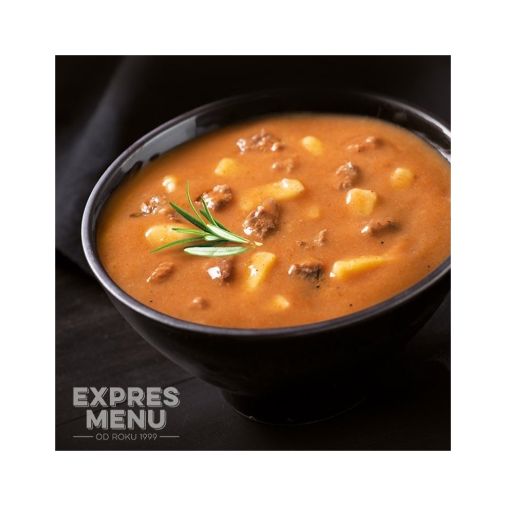 Expres Menu Goulash Soup (2 Portions, 600 g) is a hearty ready-made soup with pieces of beef and potatoes, seasoned with a traditional combination of onion, paprika, garlic, and marjoram.