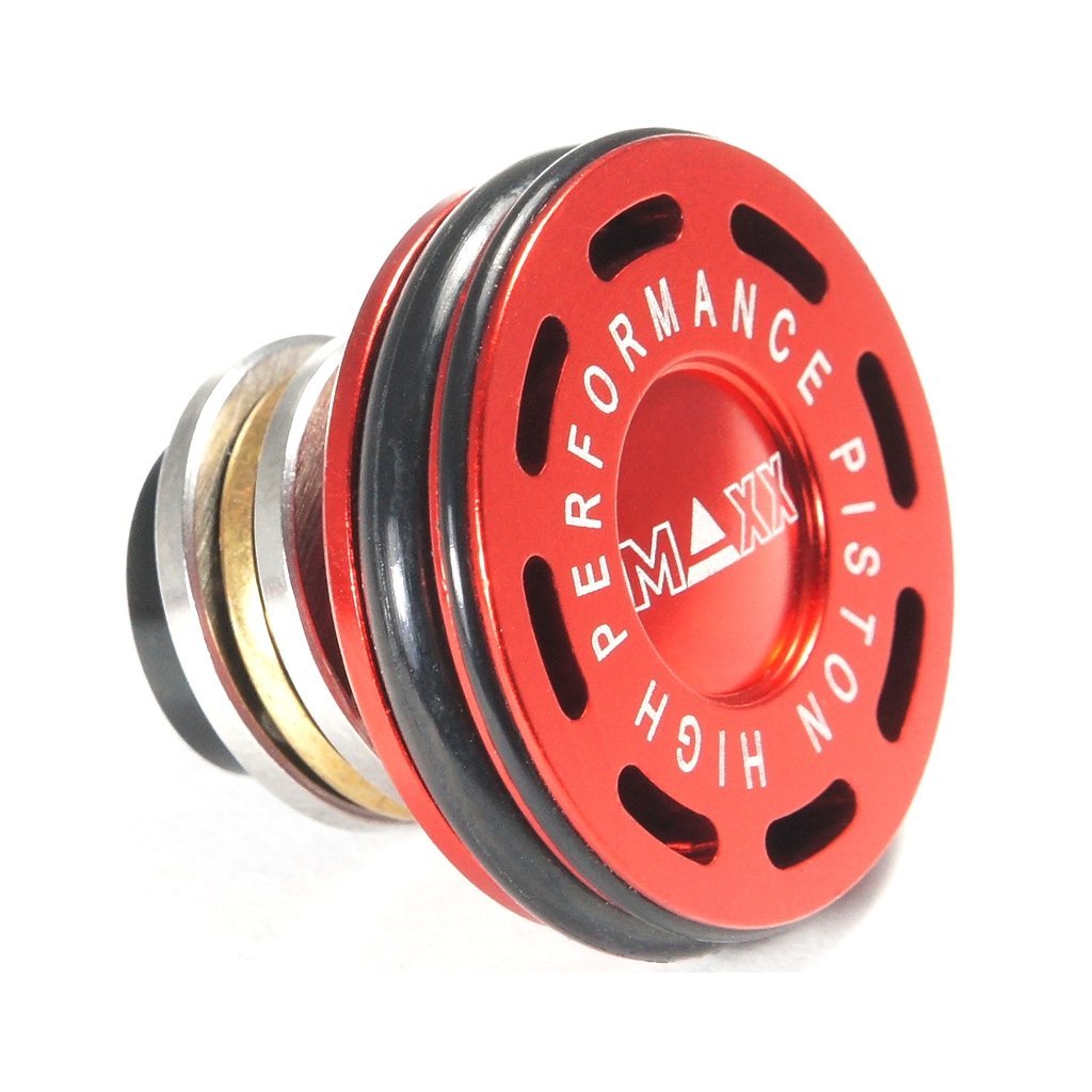 The head piston aluminum counter-pressure CNC MAXX is made from a single piece of lightweight and very durable aluminum alloy using CNC machining. The double O-ring seal design minimizes compressed air leakage between the piston head and cylinder, contributing to increased and stabilized performance. The integrated ball bearing reduces torsional stress on the spring during compression and return, ensuring smoother operation and extending the lifespan of internal parts. The piston head is compatible with most V2 gearboxes and is designed for electric airsoft guns.