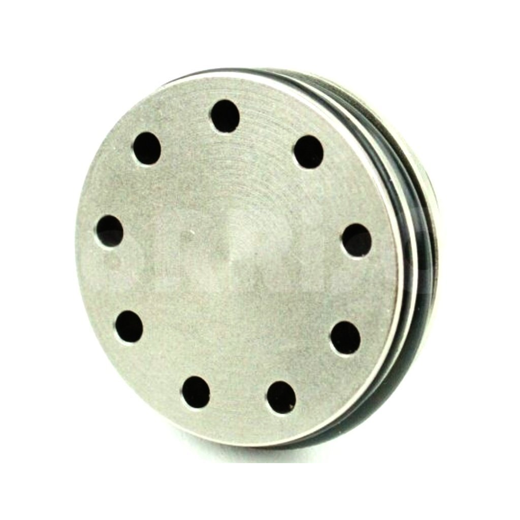 The piston CNC duralumin head with axial bearing is made of duralumin EN AW 6012 T6 on a CNC machining center and excels in high processing precision with a low weight of 11.3 g. There are nine holes on the front side, through which air flows when compressed and expands the sealing O-ring, which improves the sealing of the space between the piston head and the cylinder. The design is complemented by an axial ball bearing allowing the spring to rotate smoothly during compression, which significantly increases its service life. The centering ring helps prevent damage to the cylinder and the relief on the rear wall contributes to an increase in muzzle velocity.