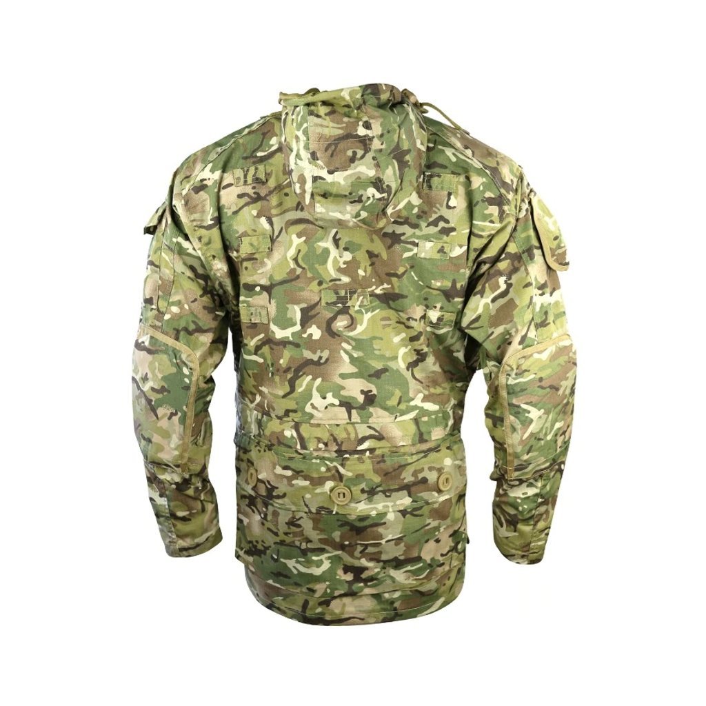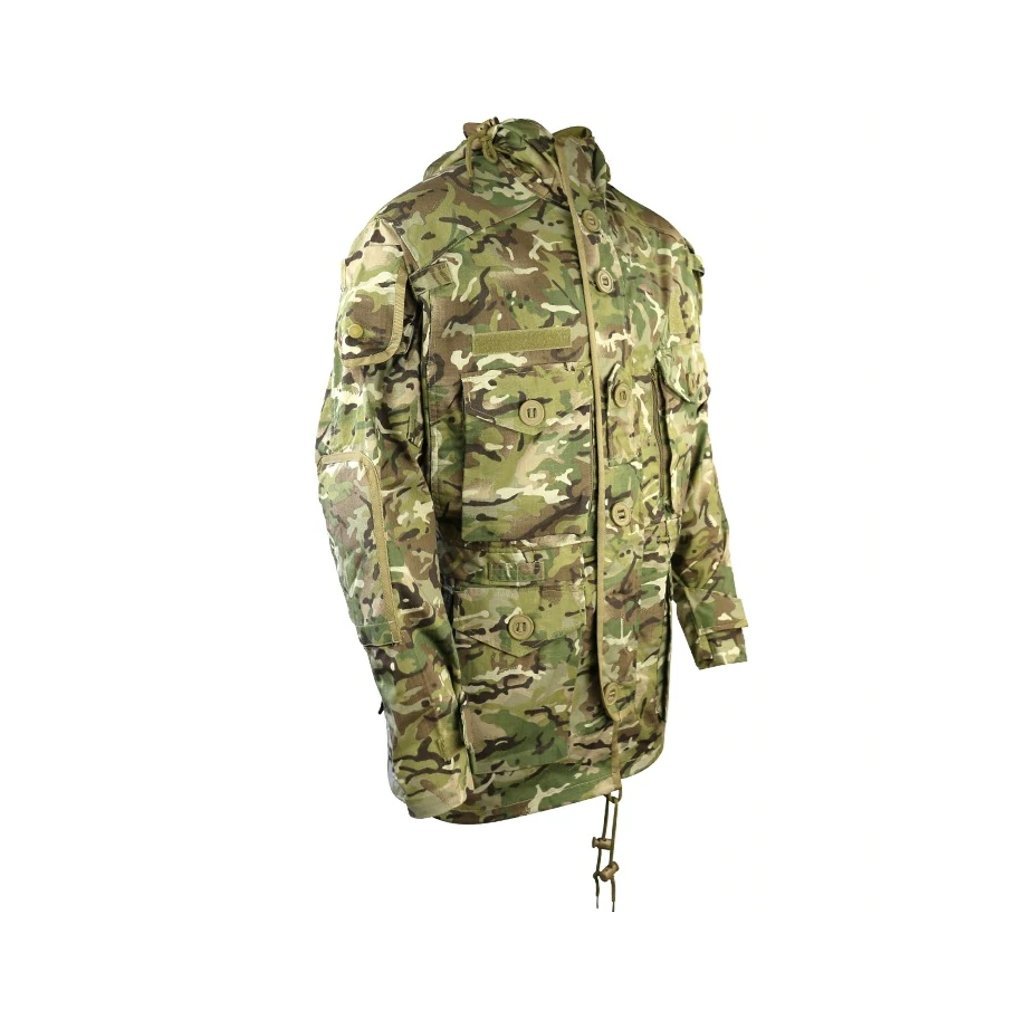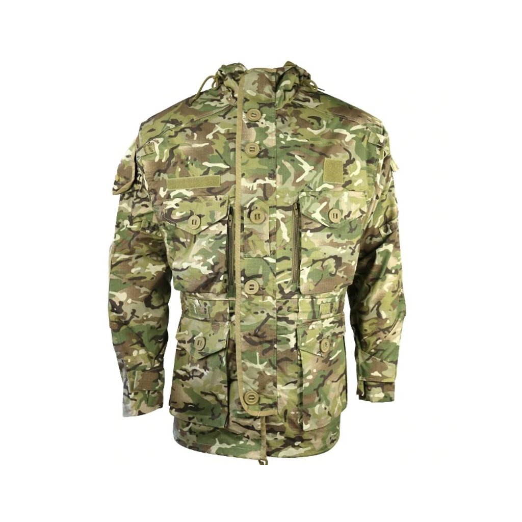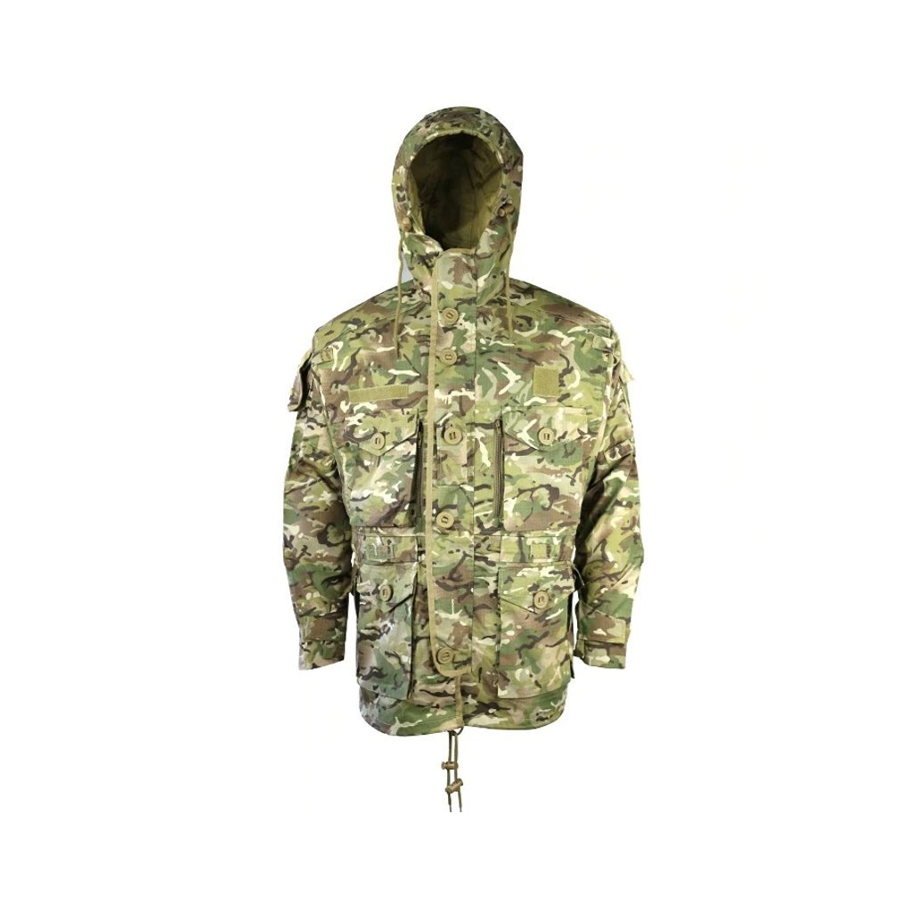 SAS Smock Jacket is inspired by British SAS tactical equipment. It features a two-way zipper covered by a button-down flap, a hidden hood in the collar, and underarm zippers for ventilation. The Jacket has four front button-flap pockets, sleeve pockets, two internal pockets, and elbow patches. For better adjustment, it is equipped with a drawstring at the waist and a huge back pocket measuring 42x24 cm, suitable for storing larger items.