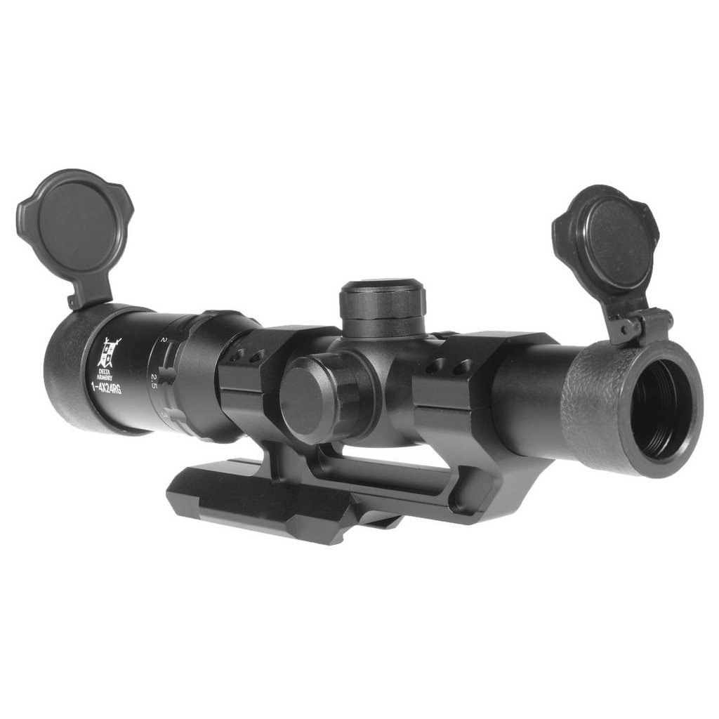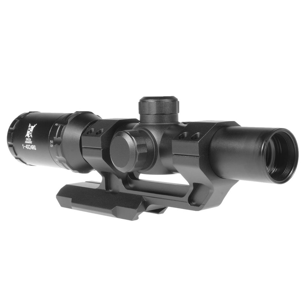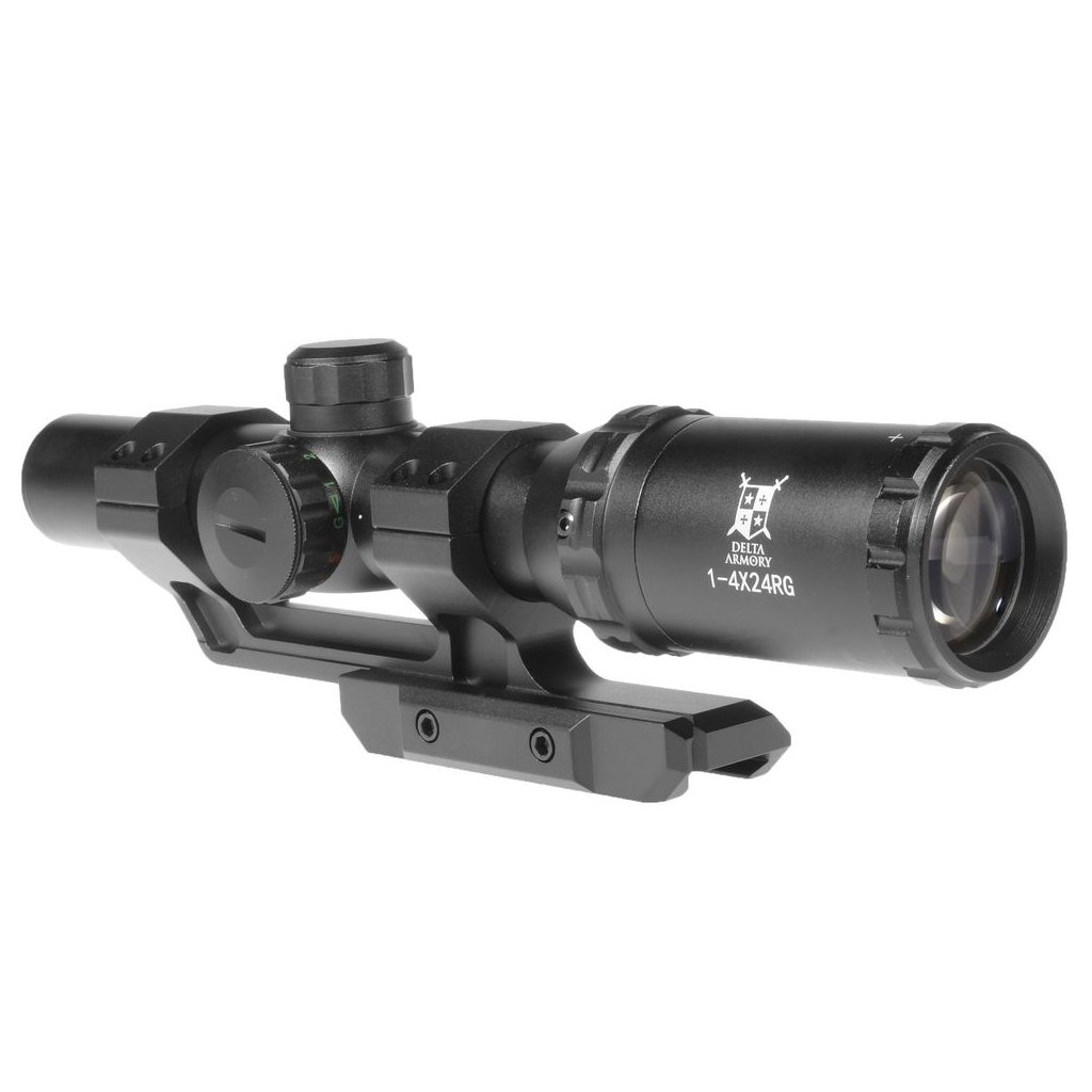 Optics from Delta Armory are made of metal. It mounts onto a 22mm RIS rail. Magnification is adjustable from 1 to 4x. The reticle is adjustable horizontally and vertically. The reticle has the option of illumination in two colors, red and green, and in various illumination intensities from 1 to 5.