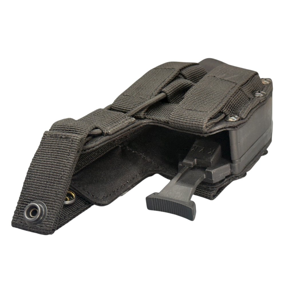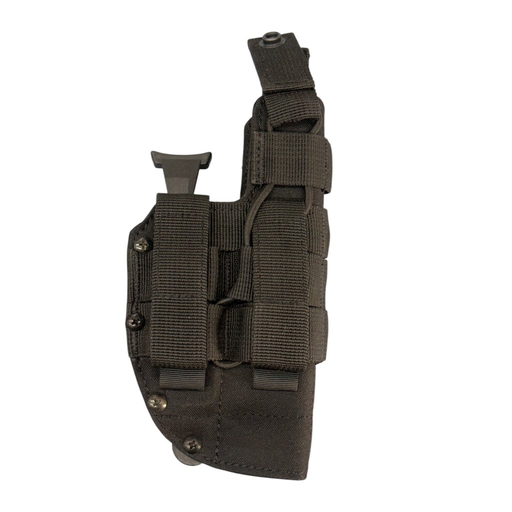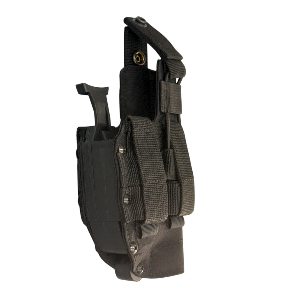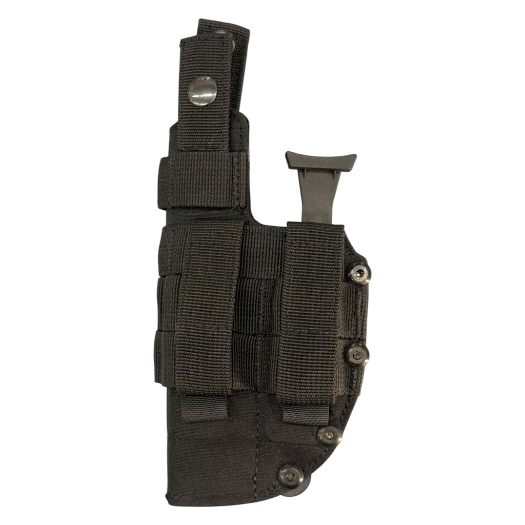 Pistol holster, with a quick-release system. A rigid holster protects your pistol and holds it securely, but allows for a quick draw when needed. Extra elastic retention sling holds the weapon securely in the holster during the most demanding activities and releases when unlatched. The strong sling allows the holster to adapt to all belt sizes and stays firmly in place. This holster can also be mounted on a MOLLE-compatible panel or vest.