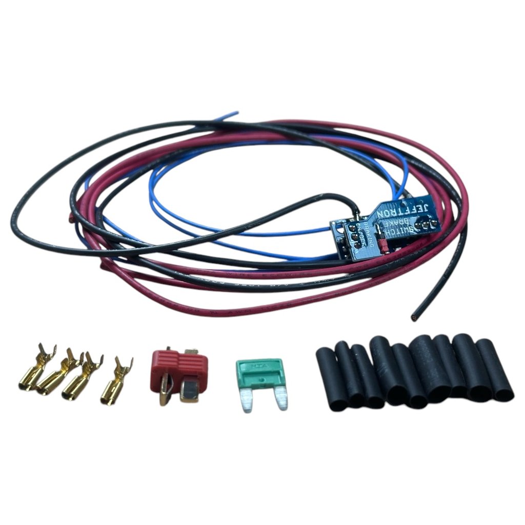 - The device has 2 black wires soldered to it with thin and rigid MPPE insulation with a cross-section of 1.5 mm2 (AWG16), 300 mm in length to the motor and 700 mm to the battery, and a blue wire with a cross-section of 0.34 mm2 (AWG22) with a length of 1000mm for connection anywhere on the red wire