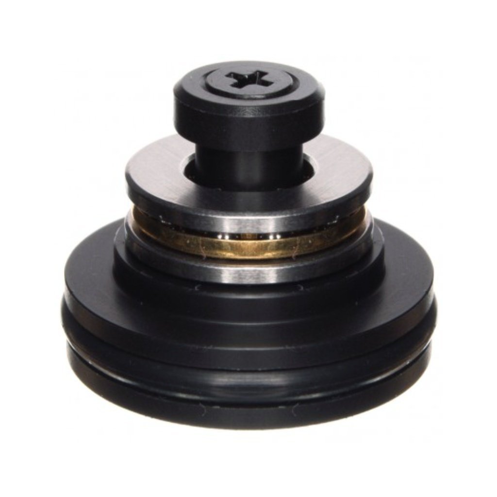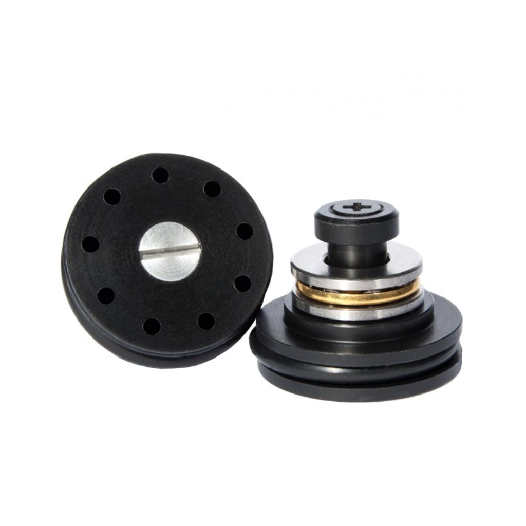 Plastic CNC piston head with axial bearing is made from TECAFORM POM engineering plastic on a CNC machining center, and thanks to its sophisticated design, it achieves a very low weight of 8.6 g. Low weight reduces gearbox load and simultaneously contributes to an increase in muzzle velocity, as the spring moves a smaller mass. Nine holes are drilled on the front side, through which air flows during compression and expands the O-ring seal, ensuring better sealing between the piston head and the cylinder. The construction includes an axial ball bearing, which allows the spring to rotate smoothly during compression, significantly extending its lifespan.