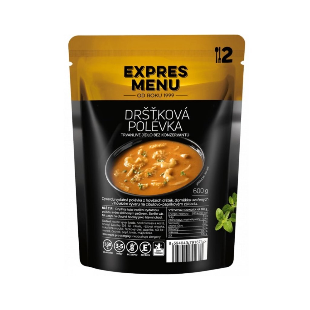 Tripe Soup (2 Portions 600g) – Expres menu brings the authentic taste of Czech classics. Beef tripe is cooked to tenderness in a rich beef broth with onion and paprika. The soup is prepared with carefully selected ingredients that guarantee traditional taste and heartiness. A great choice for a quick lunch or dinner, which you can complement with your favorite bread.