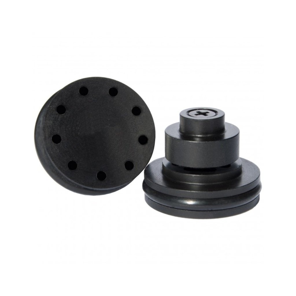 The piston ULTRA LIGHT CNC POM head is made of TECAFORM POM engineering plastic on a CNC machining center and, thanks to its sophisticated design, it has a very low weight of 5.4 g. The low weight reduces stress on the gearbox and contributes to an increase in muzzle velocity, as spring moves less mass. Nine holes are drilled on the front side, through which air flows when compressed and expands the sealing O-ring, ensuring a perfect seal between the piston head and the cylinder. There are eight weight-reducing holes on the back, which further reduce the overall weight. The piston head does not contain an axial ball bearing; instead, a washer made of TECAFORM material with identical dimensions and lower weight is used, which is suitable for use with springs up to M130.