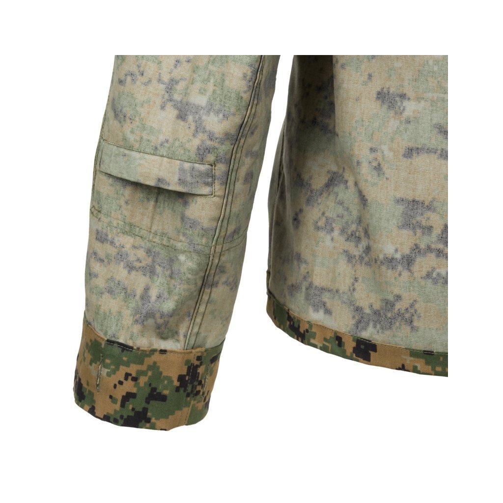 - Pockets: chest and sleeve pockets with velcro panels