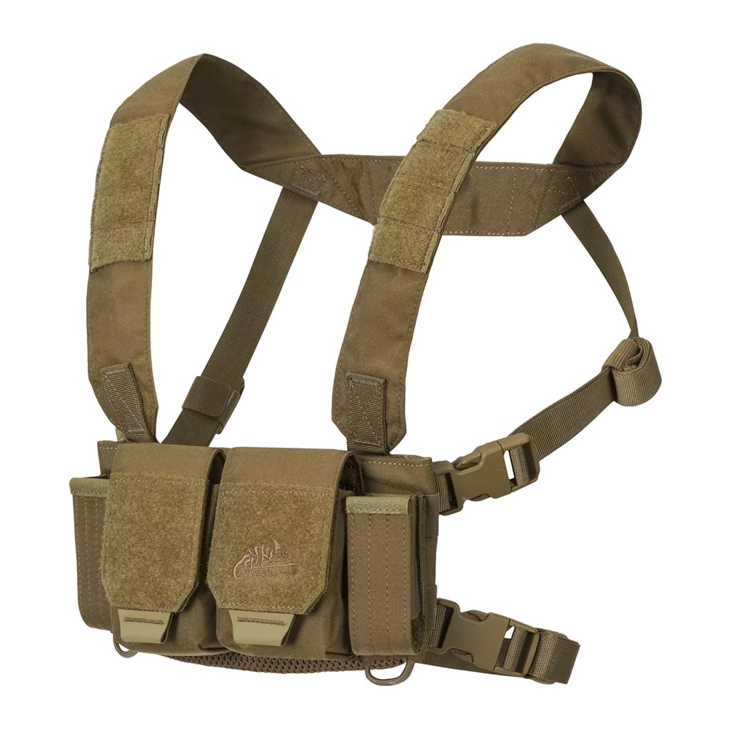 Hrudní nosný systém COMPETITION MultiGun Rig® od společnosti Helikon-Tex v barevném provedení Coyote je modulární platforma určená pro efektivní přenášení zásobníků a dalšího vybavení při sportovní střelbě i taktických operacích. Systém je vyroben z odolných materiálů, které zajišťují dlouhou životnost a spolehlivost v náročných podmínkách. Ergonomický design umožňuje rovnoměrné rozložení hmotnosti a pohodlné nošení i při delším použití. Přední panel je vybaven několika kapsami pro zásobníky různých typů (puškové, pistolové, brokové), které lze individuálně konfigurovat dle potřeby uživatele. Nastavitelný popruhový systém umožňuje přizpůsobení velikosti a zajišťuje stabilitu při pohybu. Systém je kompatibilní s dalšími doplňky řady COMPETITION a MOLLE/PALS příslušenstvím, což zvyšuje jeho univerzálnost a možnosti rozšíření.