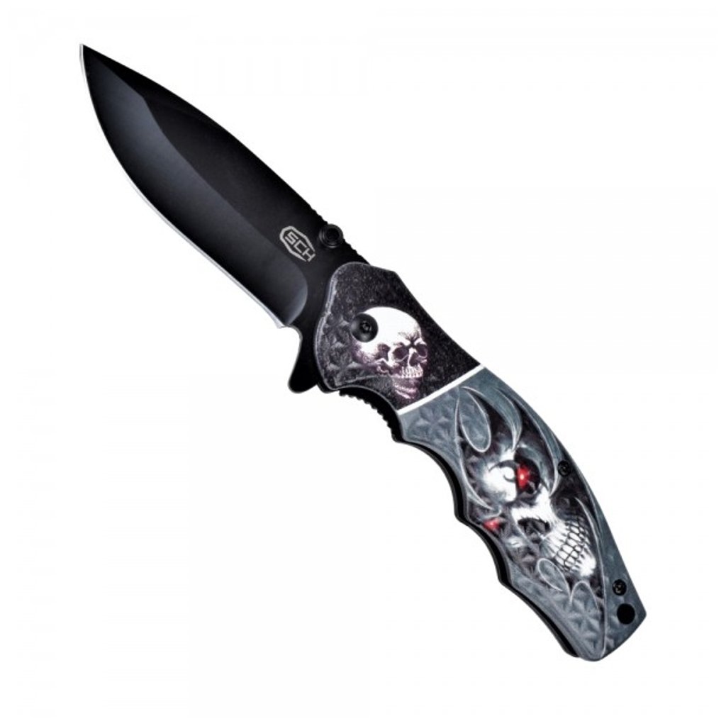 Kapesní zavírací nůž SCK je praktický nástroj vhodný pro každodenní použití. Je vybaven hladkou čepelí z nerezové oceli, která zajišťuje přesný a čistý řez. Ergonomicky tvarovaná rukojeť je doplněna stylizovaným motivem lebky a nabízí pevný a bezpečný úchop. Nůž je opatřen kovovým klipsem pro snadné uchycení k opasku nebo kapse. Zavírací mechanismus umožňuje bezpečné a pohodlné otevírání i zavírání jednou rukou. Celkové provedení zaručuje spolehlivost a dlouhou životnost výrobku.