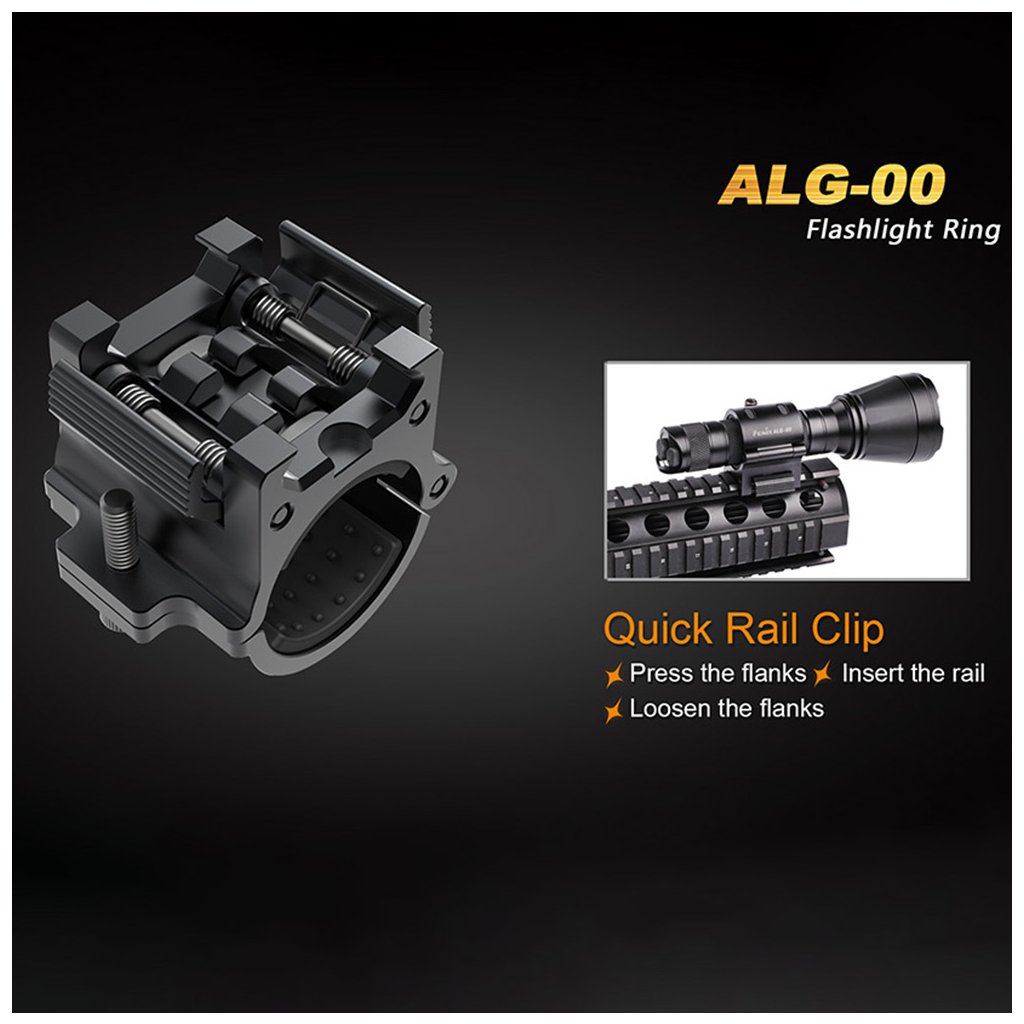Kovová montáž ALG-00 pro svítilny (PD32, PD35, UC35, TK09, TK15, TK16, TK20R, TK32) - Fenix je rychloupínací kovová montáž svítilny na zbraňovou lištu Weaver / Picatinny, určená pro svítilny s průměrem těla 22,5–26 mm.