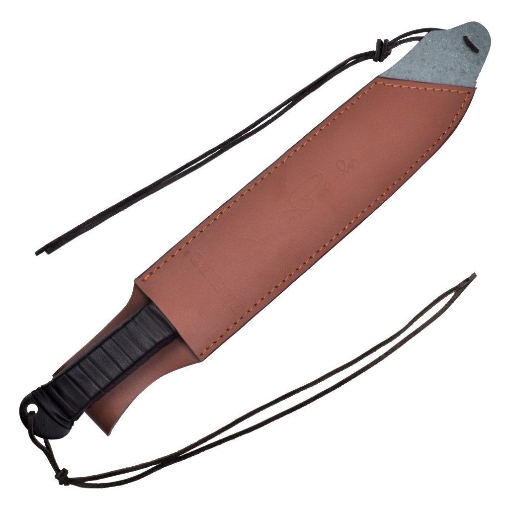 Rukojeť je z oceli potažené černou kůží, což zajišťuje pevný a pohodlný úchop i při delším používání. Součástí balení je kožené pouzdro s vygravírovaným podpisem Johna Ramba a praktickým poutkem pro uchycení na opasek. Celková délka nože včetně pouzdra je 510 mm.