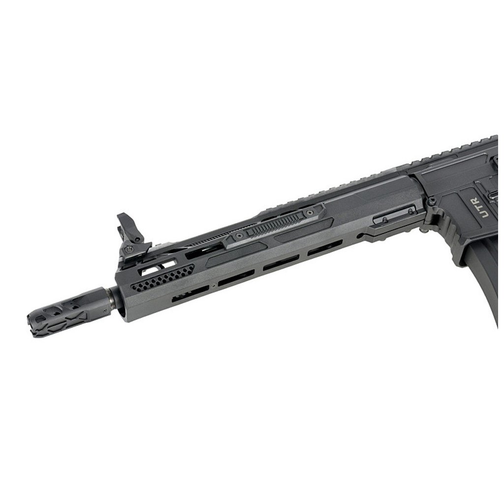 Airsoftová replika M916G UTR556 od výrobce Double Eagle představuje moderní ztvárnění pušky typu AR-15 v černém provedení. Zbraň je vybavena oboustranným přepínačem režimu střelby a záchytem zásobníku, což zajišťuje plnohodnotné ovládání jak pro praváky, tak pro leváky. Předpažbí je vyrobeno z odolného polymeru (Nylon) a je kompatibilní se systémem montáže M-LOK. Tělo a pažba zbraně jsou kombinací polymeru (Nylon) a kovu, což přispívá k nízké hmotnosti a zároveň zachovává potřebnou odolnost.