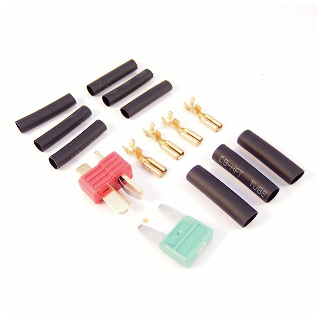 - Na zařízení jsou připájeny 2 černé vodiče s tenkou a tuhou MPPE izolací o průřezu 1,5 mm2 (AWG16), délka 300 mm k motoru a 700 mm k baterii, a modrý vodič o průřezu 0,34 mm2 (AWG22) s délkou 1000mm pro připojení kamkoliv na červený vodič