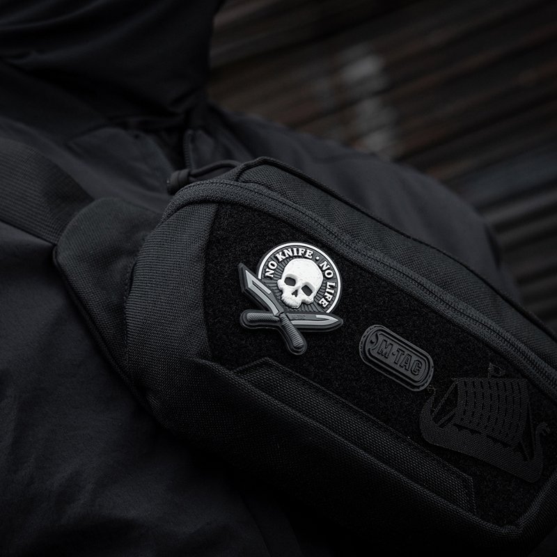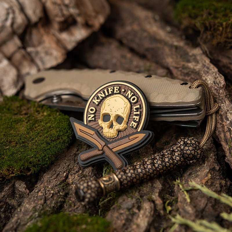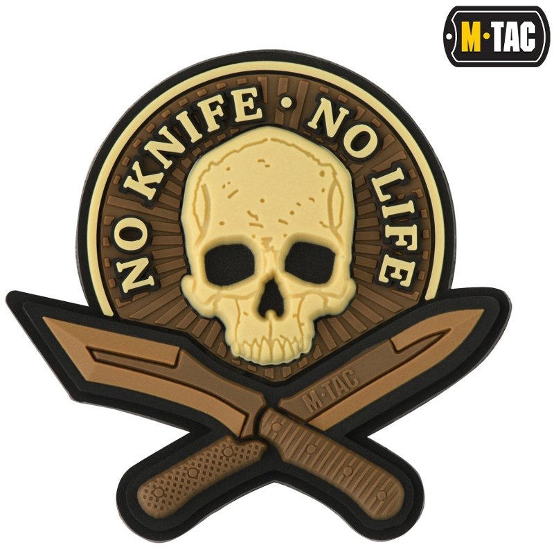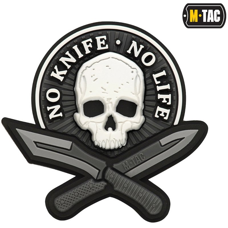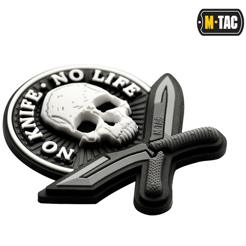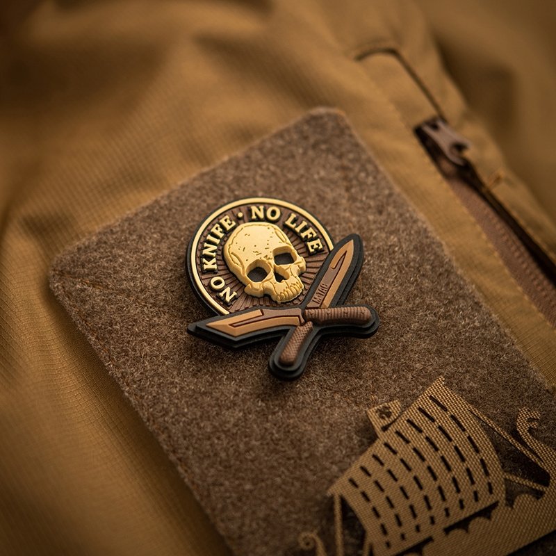 M-Tac No Knife - No Life 3D Patch - tzv. "Morale nášivky" - lze připevnit na suchý zip na rukávu (suchý zip je našitý na zadní straně nášivky), nebo na vybavení - batohy, helmy , atd. Nejsou zákonem stanovené, ale lze je nosit jak v bojové oblasti, tak mimo ni. Výrobní materiál - pryž.
