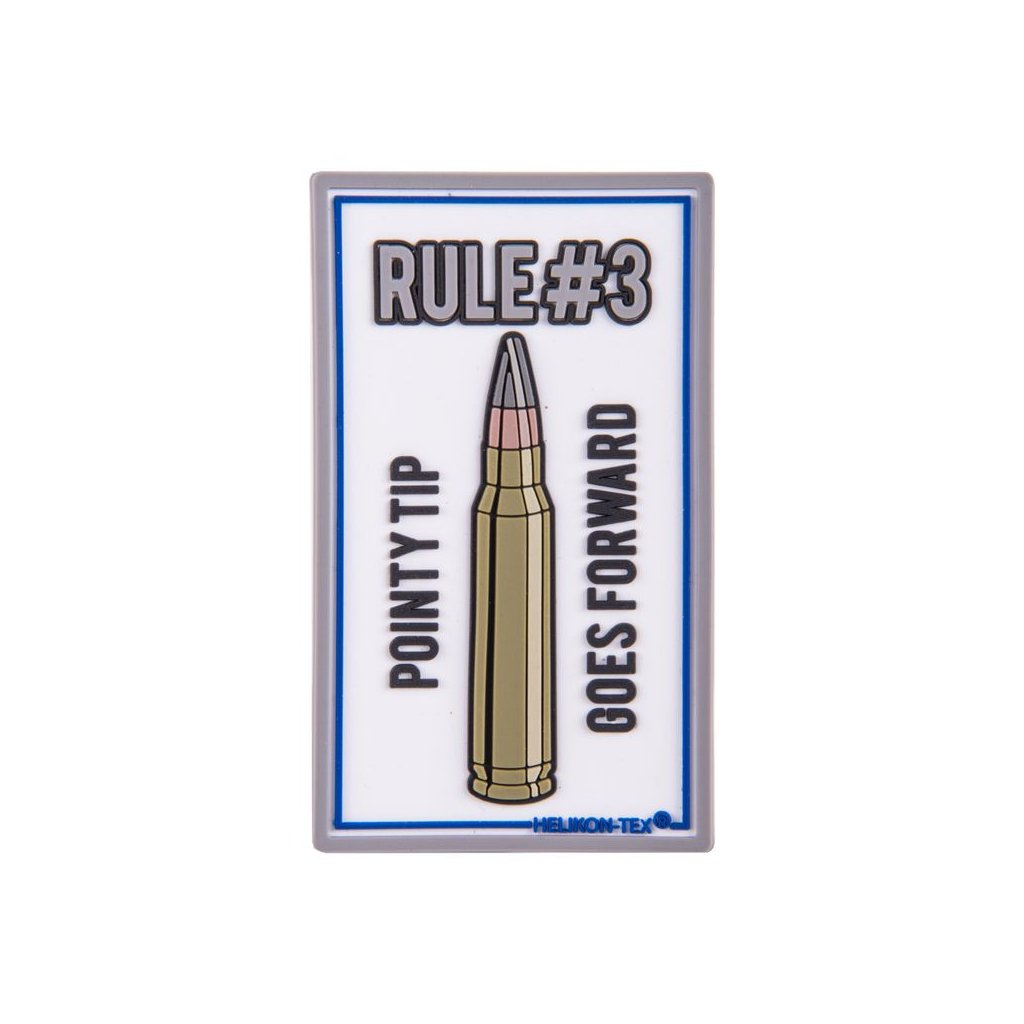 Nášivka z PVC s vtipným vyobrazením určitých pravidel pro střelné zbraně. Velkro ve spodní části umožňuje její uchycení na oblečení, batohy, tašky apod.