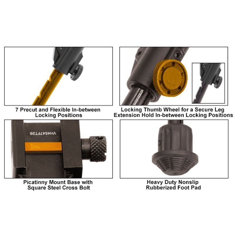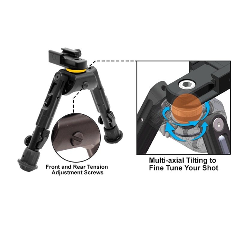 Bipod UTG Heavy Duty Recon 360 umožňuje plnou rotaci okolo osy bipodu a mírný stranový náklon. Nohy bipodu jsou výškově stavitelné, ve třech polohách, v rozsahu 5,59"/14,2 cm - 7"/17,8 cm. Kloub i konstrukce nohou jsou z oceli. Konce nožiček jsou osazeny gumovými protiskluzovými návleky.