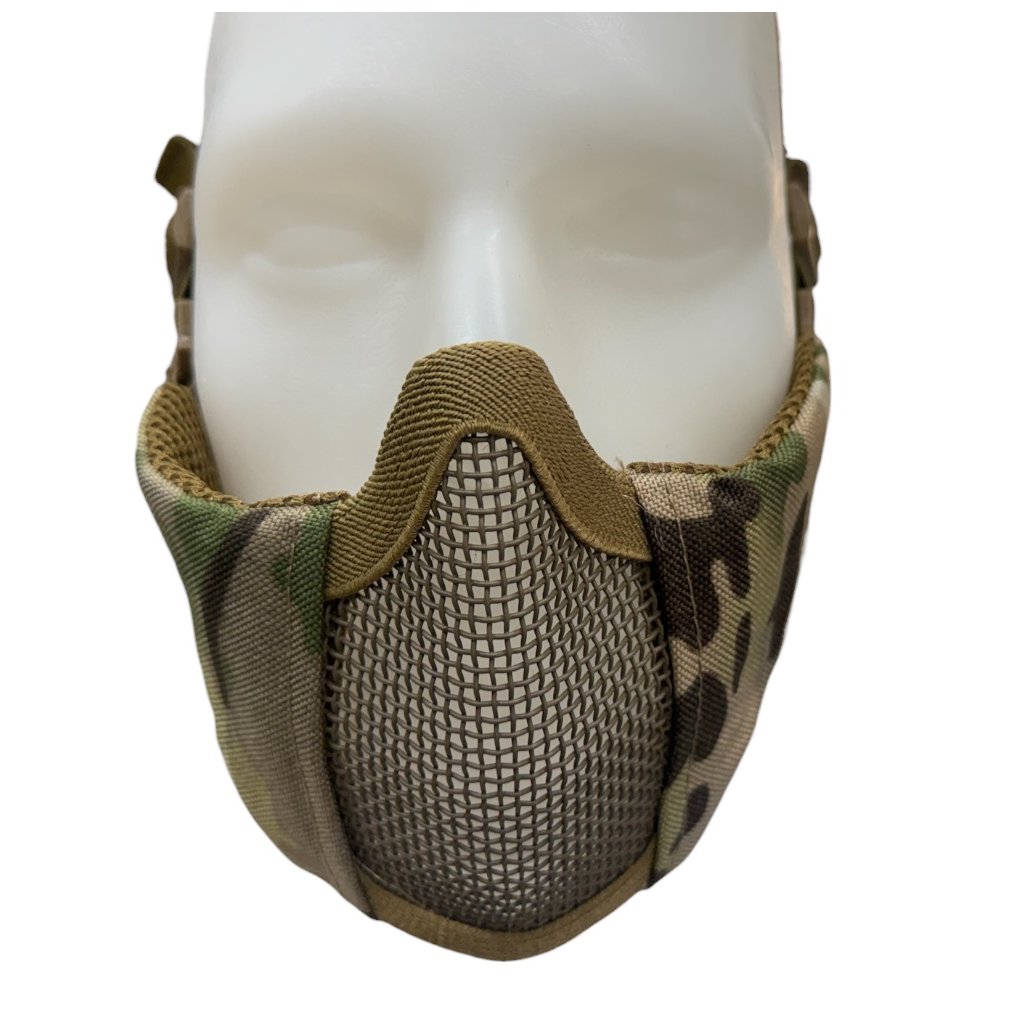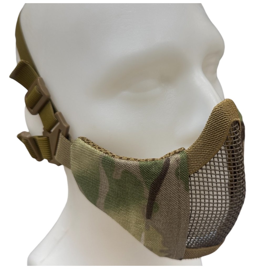 - Lehká ochranná maska na obličej s ocelovou mřížkou v provedení Multicam, vhodná pro děti, ženy a osoby s menším obličejem.