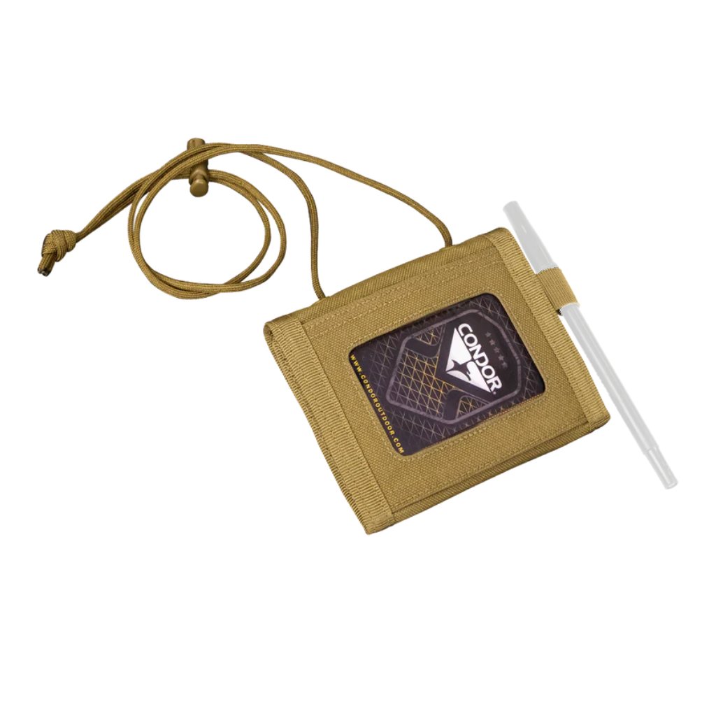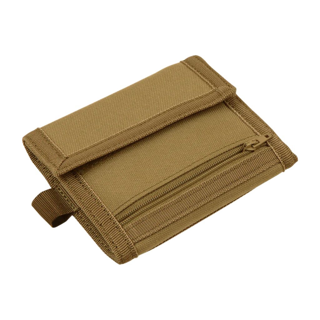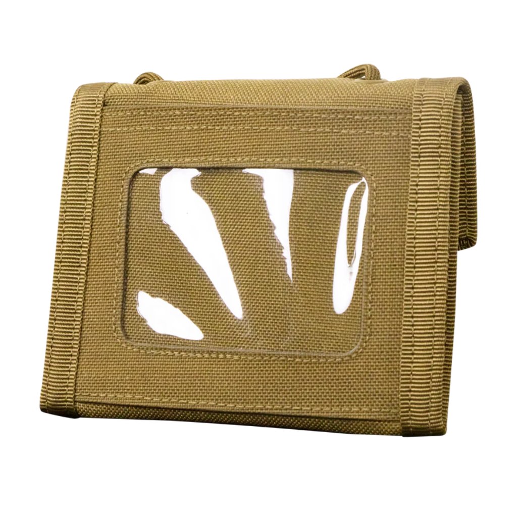 Skládací peněženka vyrobená z pevného nylonu v v barvě coyote. Ve složeném stavu (10x12cm) nabízí po celé zadní straně průhlednou kapsu na průkaz 7x10cm. Lze tedy například dokázat totožnost bez vyndání samotného občanského průkazu. Vpředu je kapsa na mince 7x10cm bezpečně uzavřená na zip. Po otevření peněženky rozepnutím suchého zipu je k dispozici hlavní kapsa na papírové bankovky 17x10cm. Dvě menší kapsy - každá o rozměru 8x9cm.