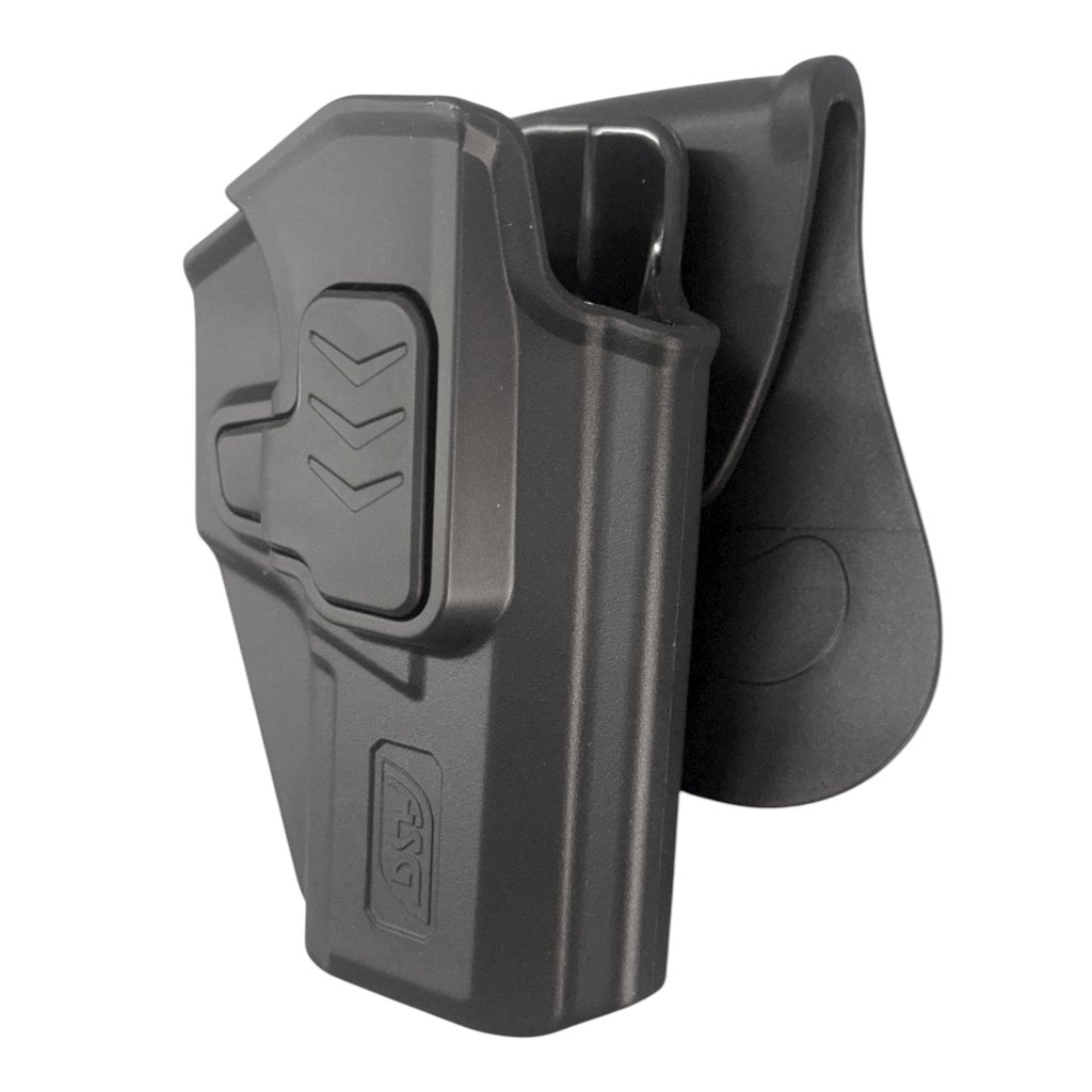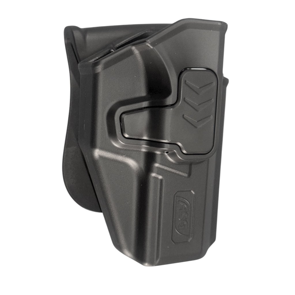 Taktické rychloupínací pouzdro je vyrobeno z odolného, špičkového černého polymeru a může se otáčet o 360 stupňů ve fixní poloze každých 9 stupňů, což umožňuje snadné nasazení pro každou aplikaci (Záda, křížové tasení, boční tasení atd.).