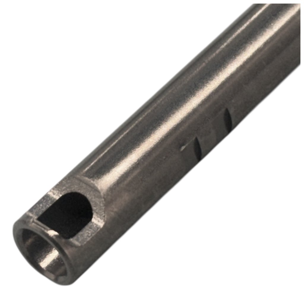 Na konci hlavně jsou dvě drážky pro instalaci tenkých o-kroužků, které optimalizují vůli mezi vnější a vnitřní hlavní. Pro tento účel doporučujeme použití tenkých EPES o-kroužků z našeho sortimentu. Hlaveň je vybavena rozšířeným hop-up okénkem, vhodným pro gumičky s vyšším přítlakem, což umožňuje přesné doladění a zvýšení výkonu zbraně.