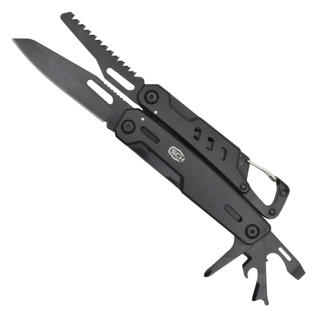 SCK multi-tool Pliers 6v1 (bit kits) jsou univerzální multifunkční kleště určené pro široké spektrum využití v každodenních i outdoorových podmínkách. Nástroj je vyroben z odolné nerezové oceli a nabízí šest základních funkcí: kleště, nůž s pojistkou typu liner lock (délka čepele 70 mm), pilku s pojistkou liner lock (délka čepele 60 mm), otvírák na víno, řezák bezpečnostních pásů a křížový šroubovák.