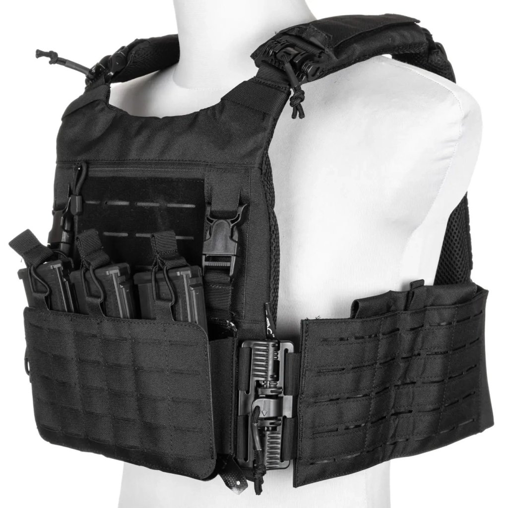 - Profesionální plate carrier v černém provedení, vhodný pro náročné podmínky.
