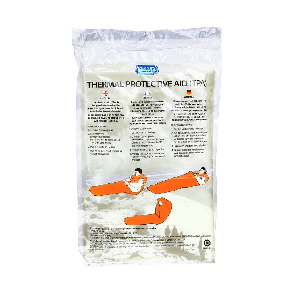 Tepelná ochranná pomůcka. Ideální použití jako nouzový hypotermický vak nebo jako mimořádný nouzový kryt, který vám umožní přežít noc bez spacáku. Vhodné zejména pro situace, kdy je život ohrožen ztrátou tělesné teploty.