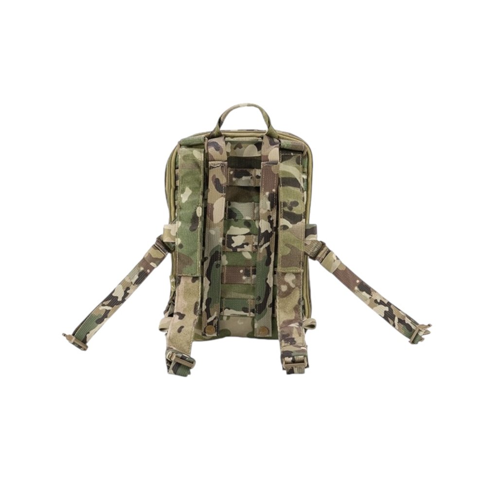 Na přední straně batohu se nacházejí dvě ploché kapsy pro rychlý přístup k drobnému vybavení. Velký VELCRO panel umožňuje umístění identifikačních nášivek. MOLLE/PALS vazba na zadní straně zajišťuje kompatibilitu s dalším modulárním vybavením. FASTEX přezky umožňují rychlé upevnění batohu nebo jeho okamžité odhození v případě potřeby. Plně nastavitelné ramenní popruhy jsou vybaveny průvlaky pro hadičku hydratačního systému. Nízkoprofilové zipy zajišťují tichý a plynulý chod.